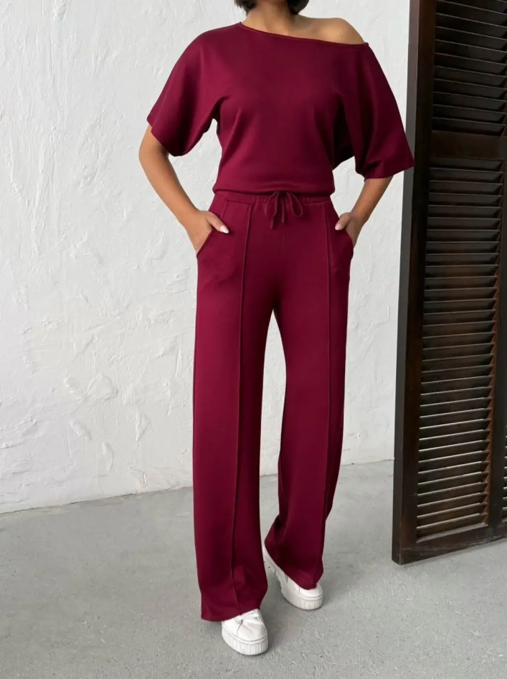 Kadın İsa Kollu Kayık Yaka Bluz Ve Pantolon Misal Kumaş Ikili Takım