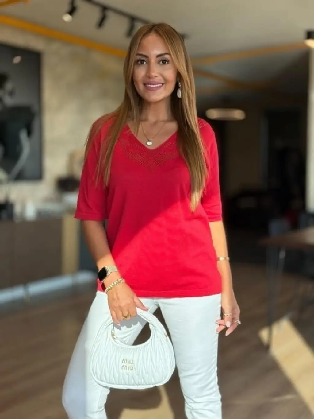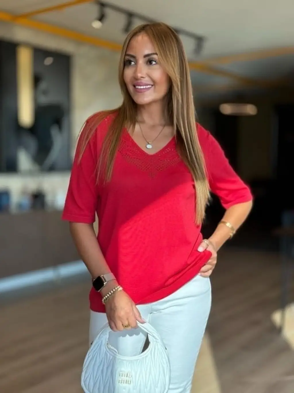 Kadın Kısa Kollu V Yaka Ajurlu Triko BluZ