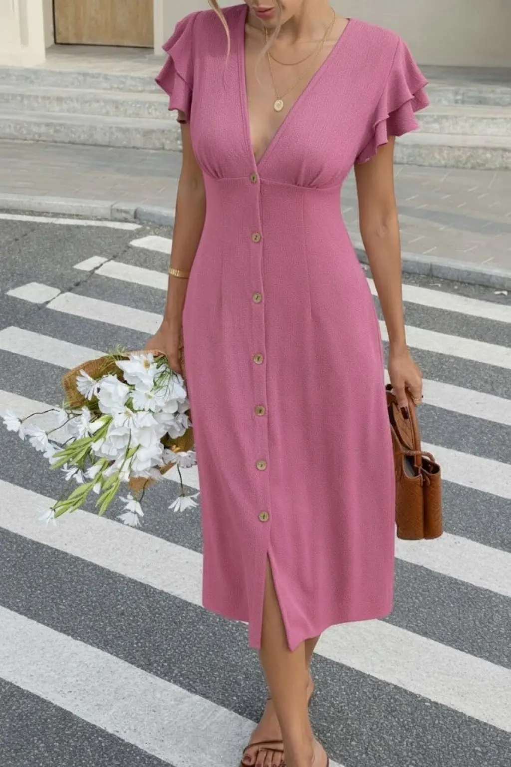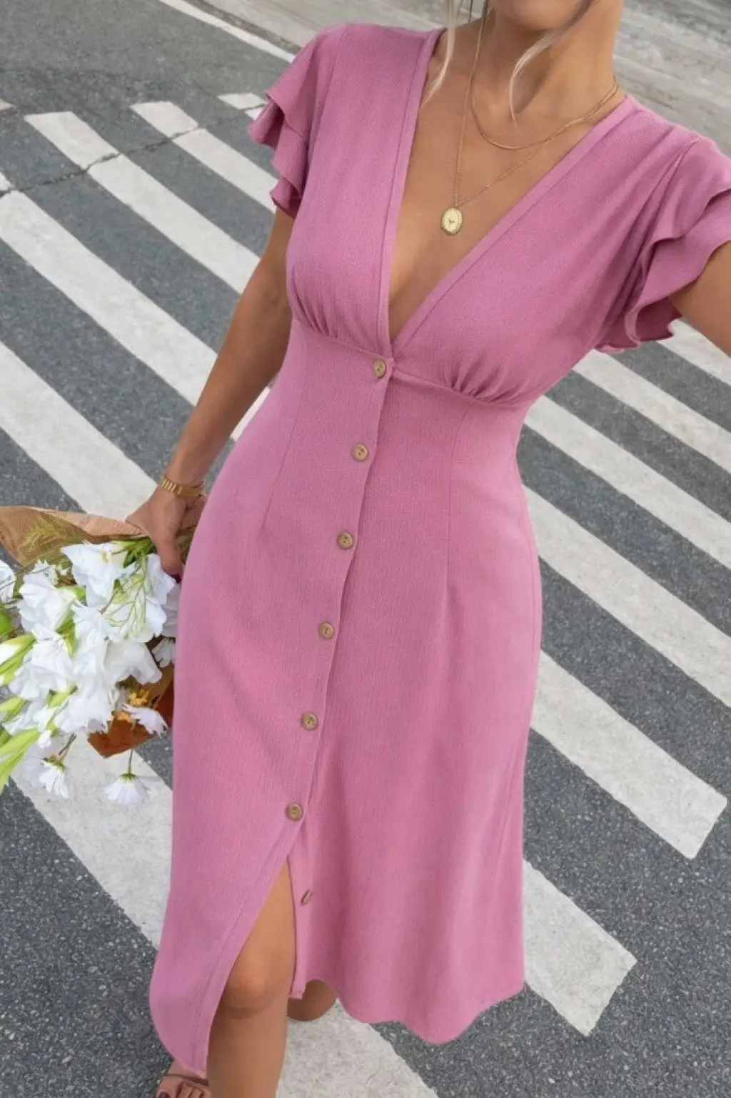 Kadın Kısa Kollu V Yakalı önden Düğmeli Bürümcük Midi Elbise