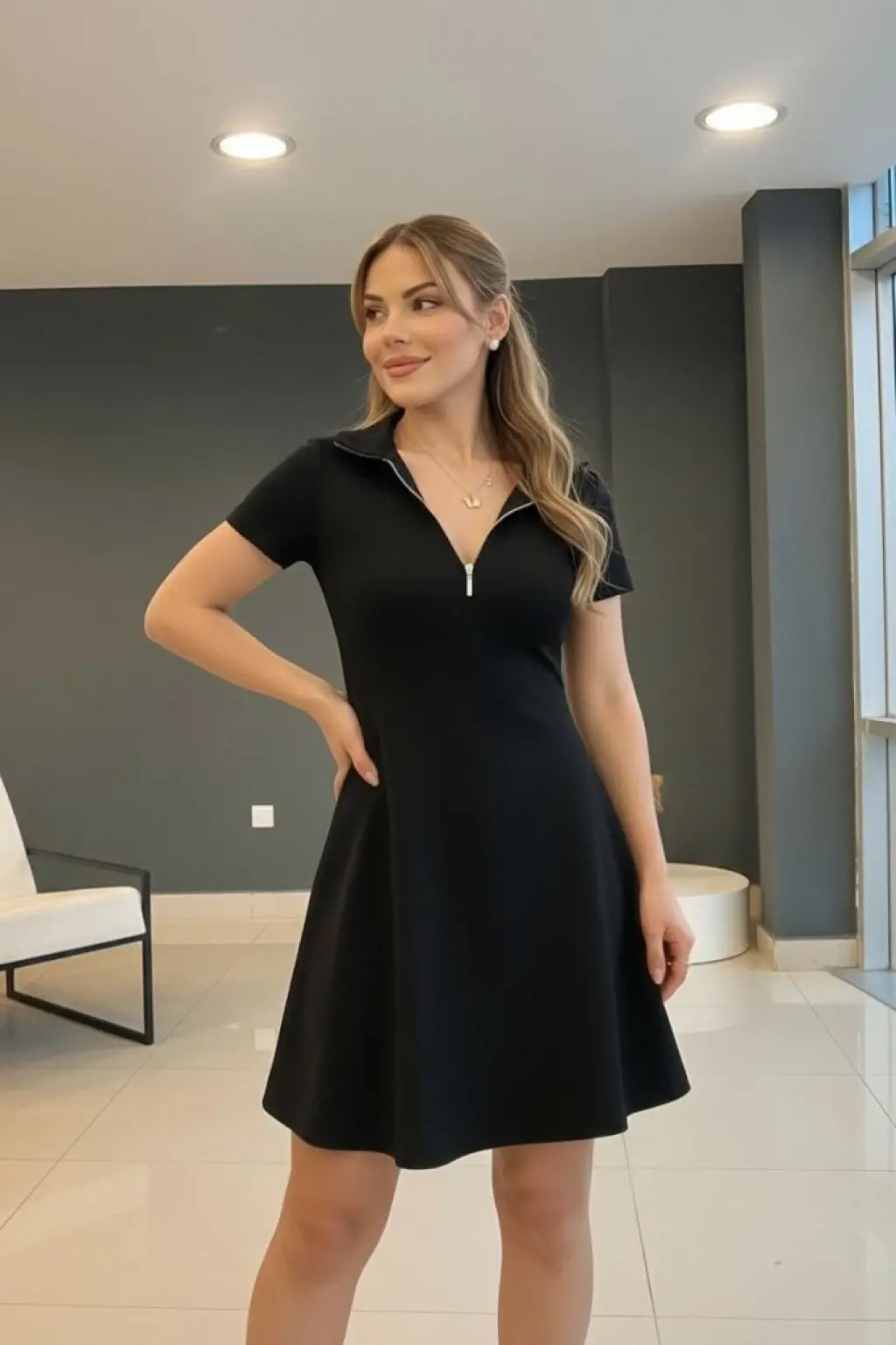 Kadın Kısa Kollu Yakası Fermuarlı Kısa Viskon Iki Iplik Elbise