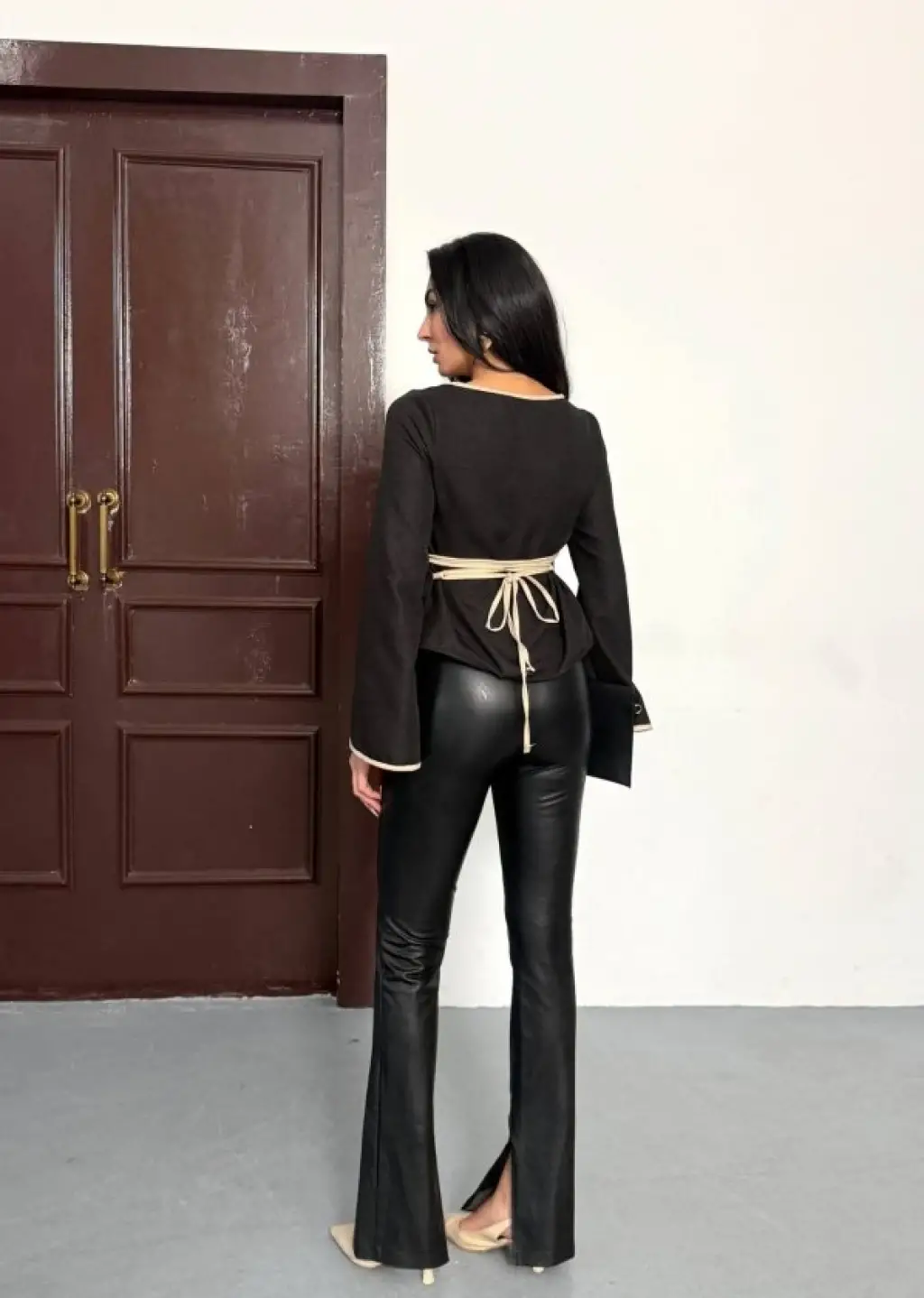Kadın Uzun Kol Asimetrik Kesim Viskon Bluz Ve çatlak Deri Görünümlü Fermuar Detaylı Yelek Ikili Takım