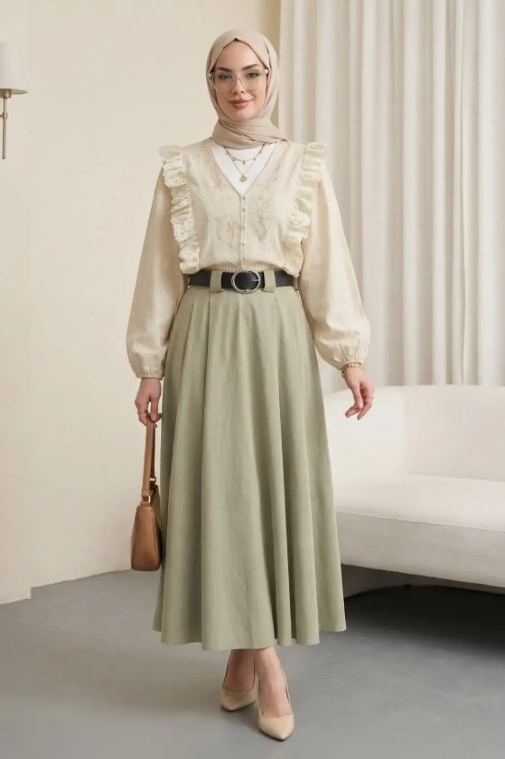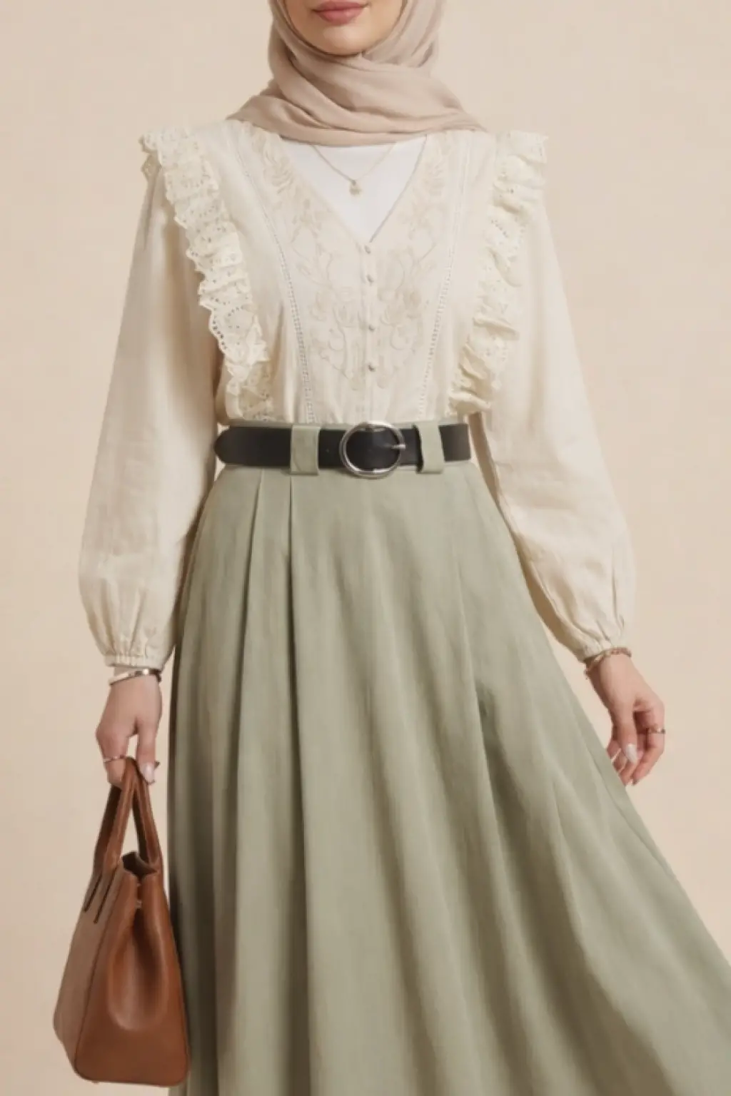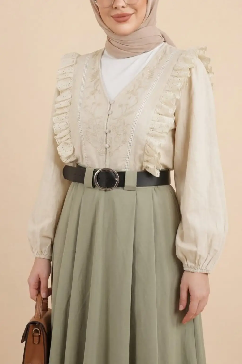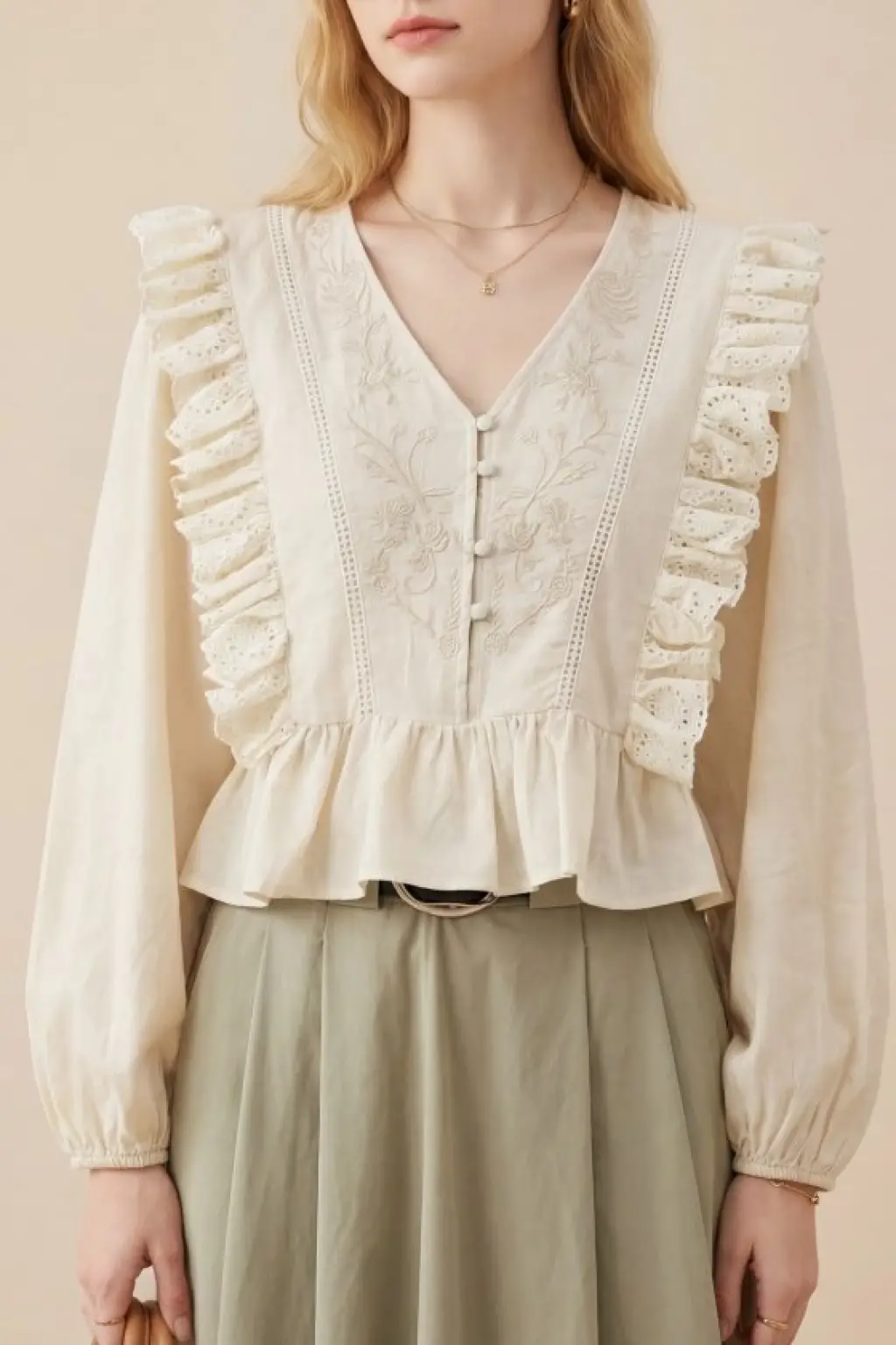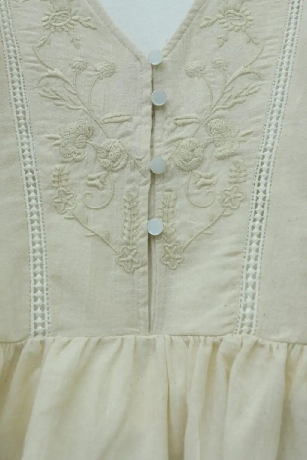 V Yaka Dantel Detaylı Nakışlı Balon Kol Keten Gömlek -Bej