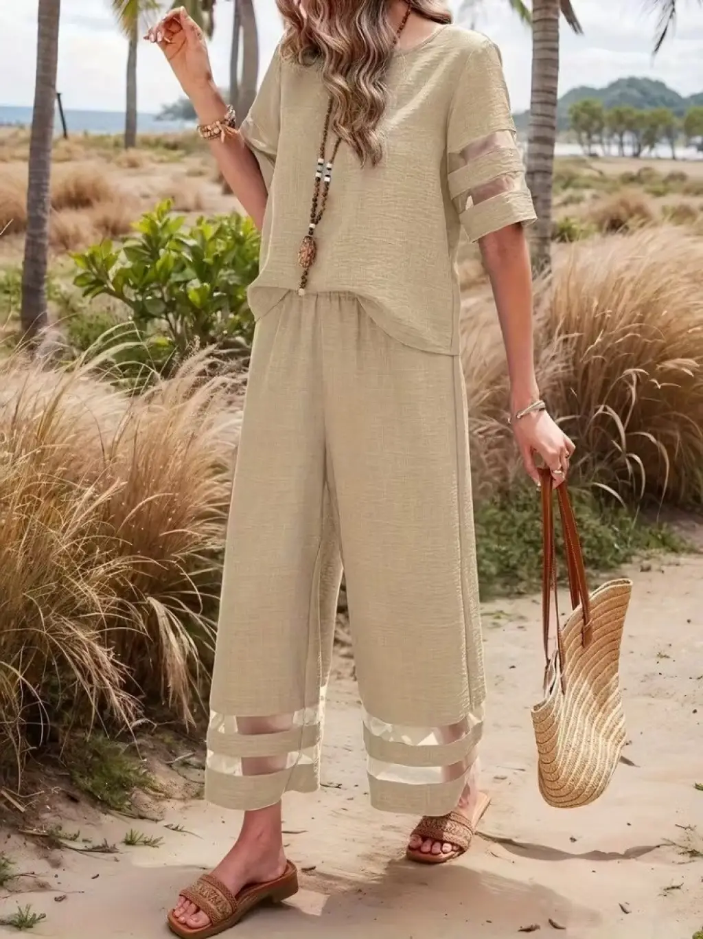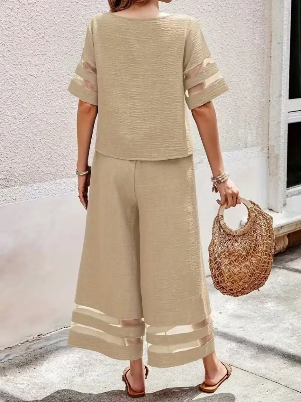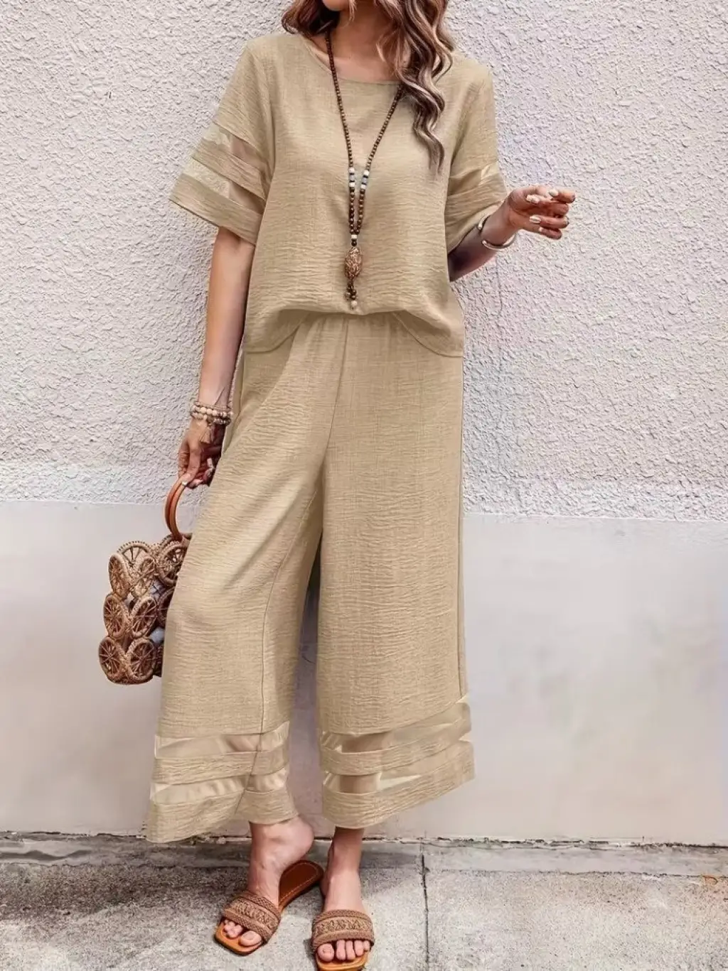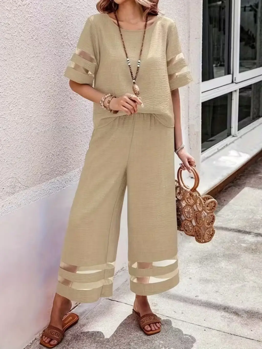 Kadın Kısa Kollu Bisiklet Yakalı Tül şerit Detaylı Bluz Ve Pantolon Ikili Takım