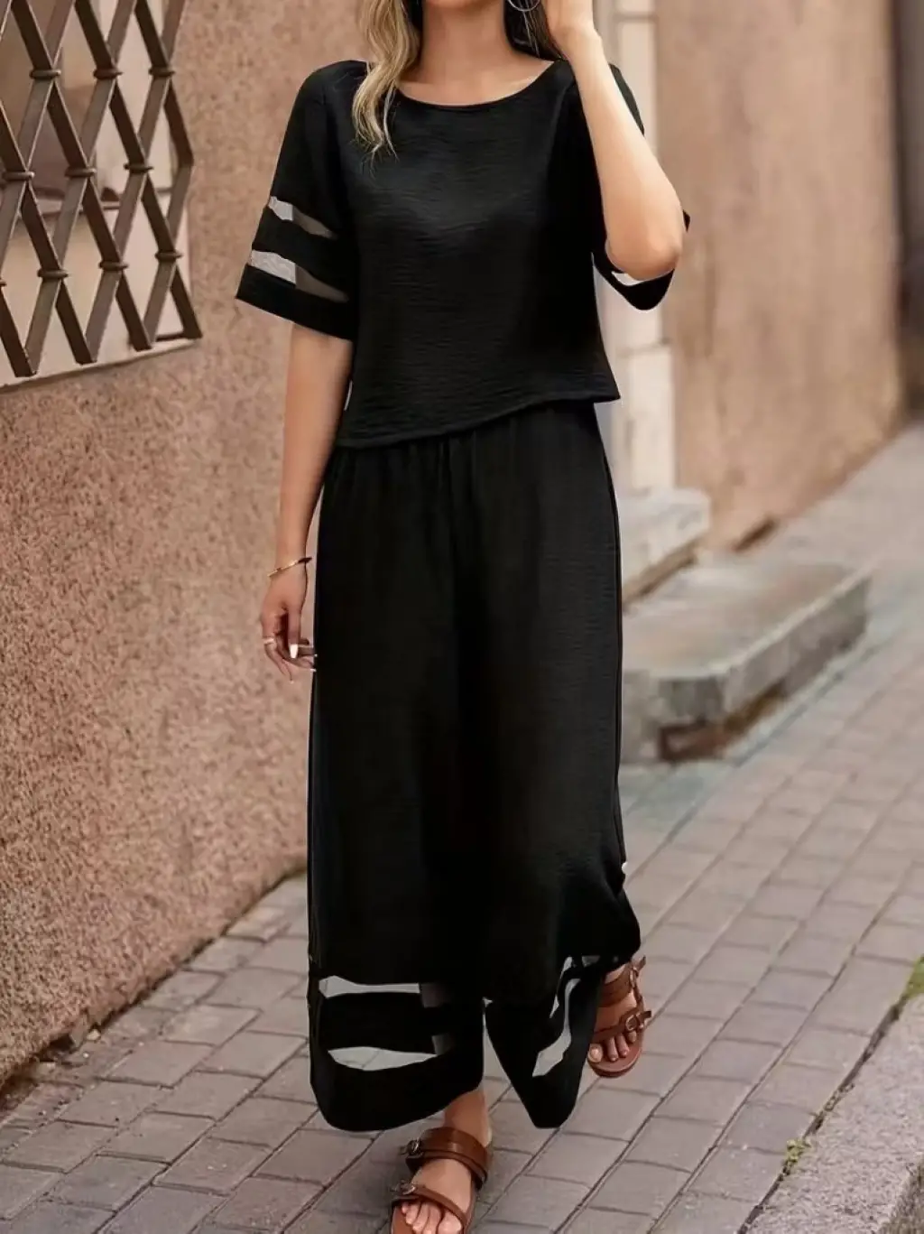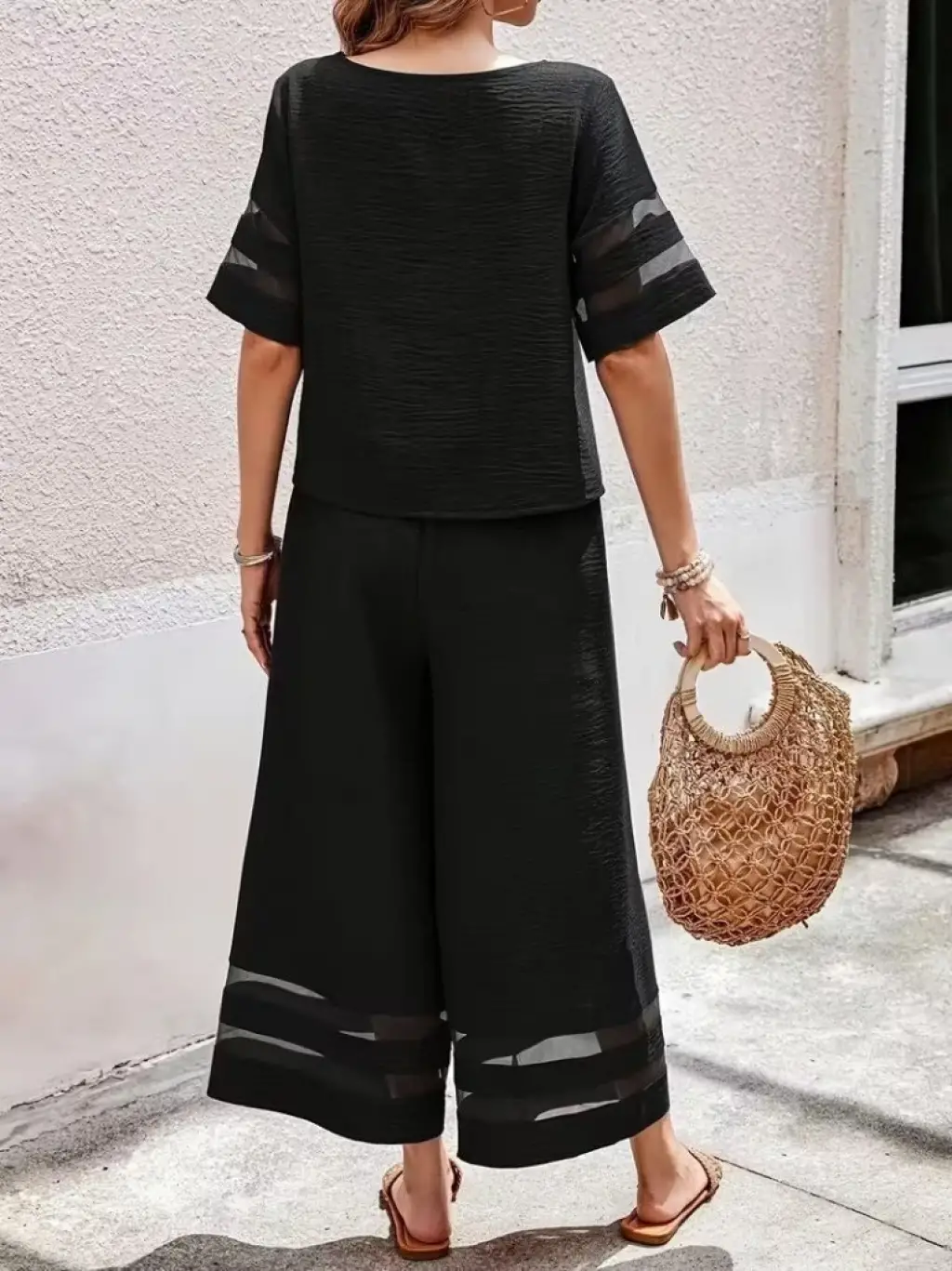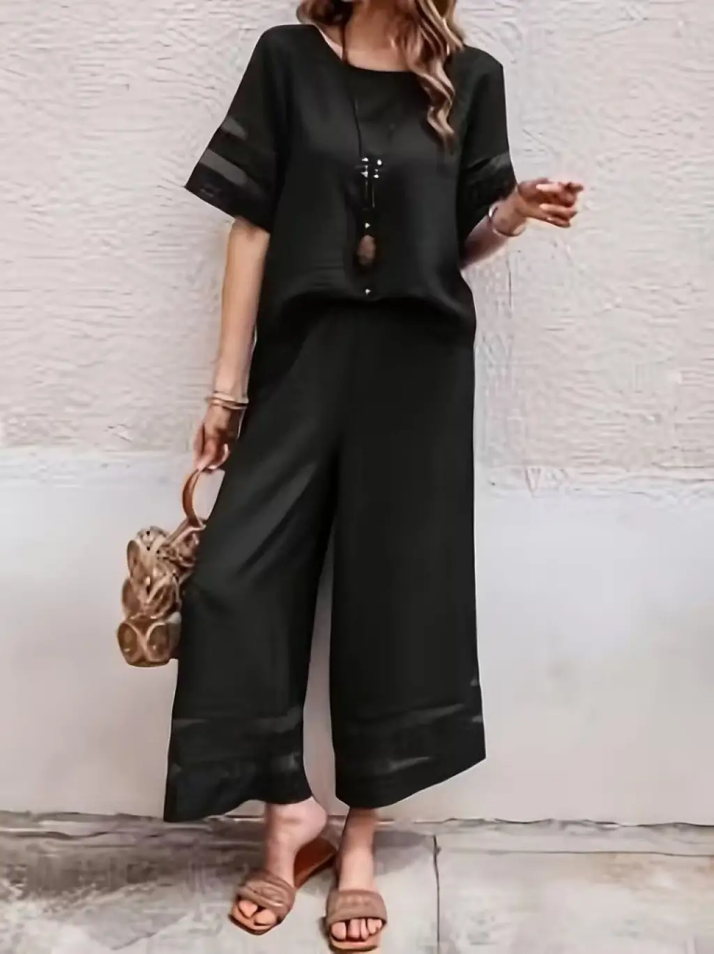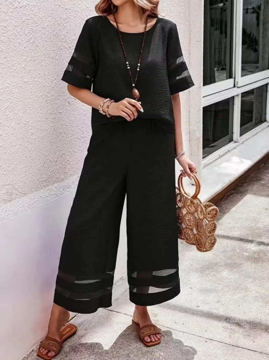 Kadın Kısa Kollu Bisiklet Yakalı Tül şerit Detaylı Bluz Ve Pantolon Ikili Takım