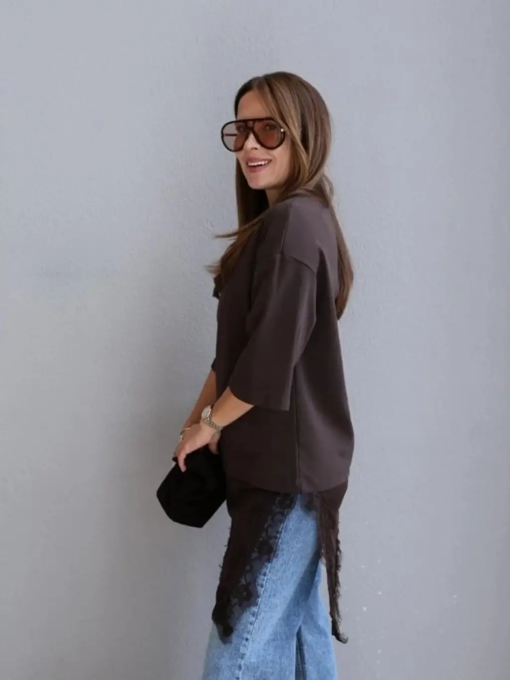 Kısa Kollu Asimetrik Kesim Dantel Güpür Detay Bluz
