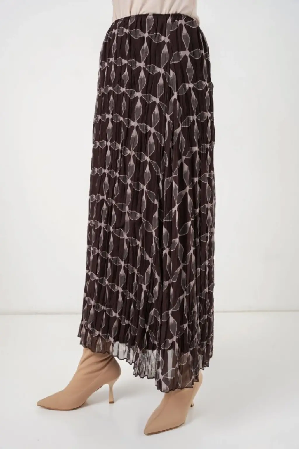 Desenli Astarlı Şifon Etek 8058 - Kahverengi