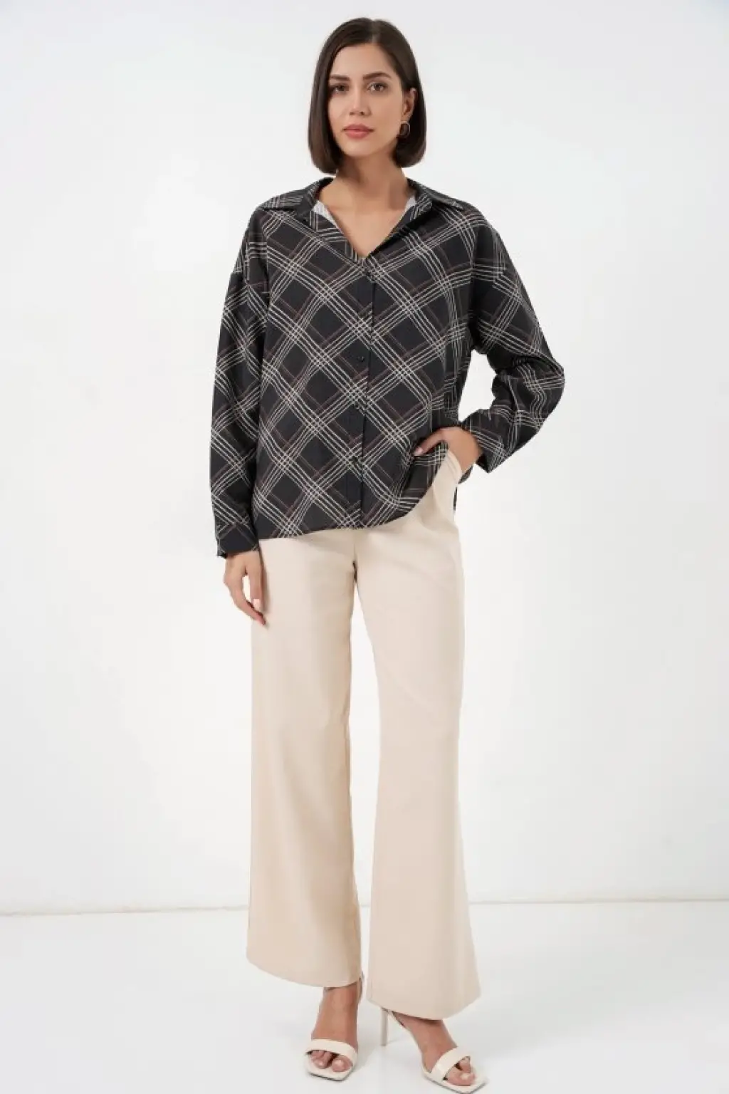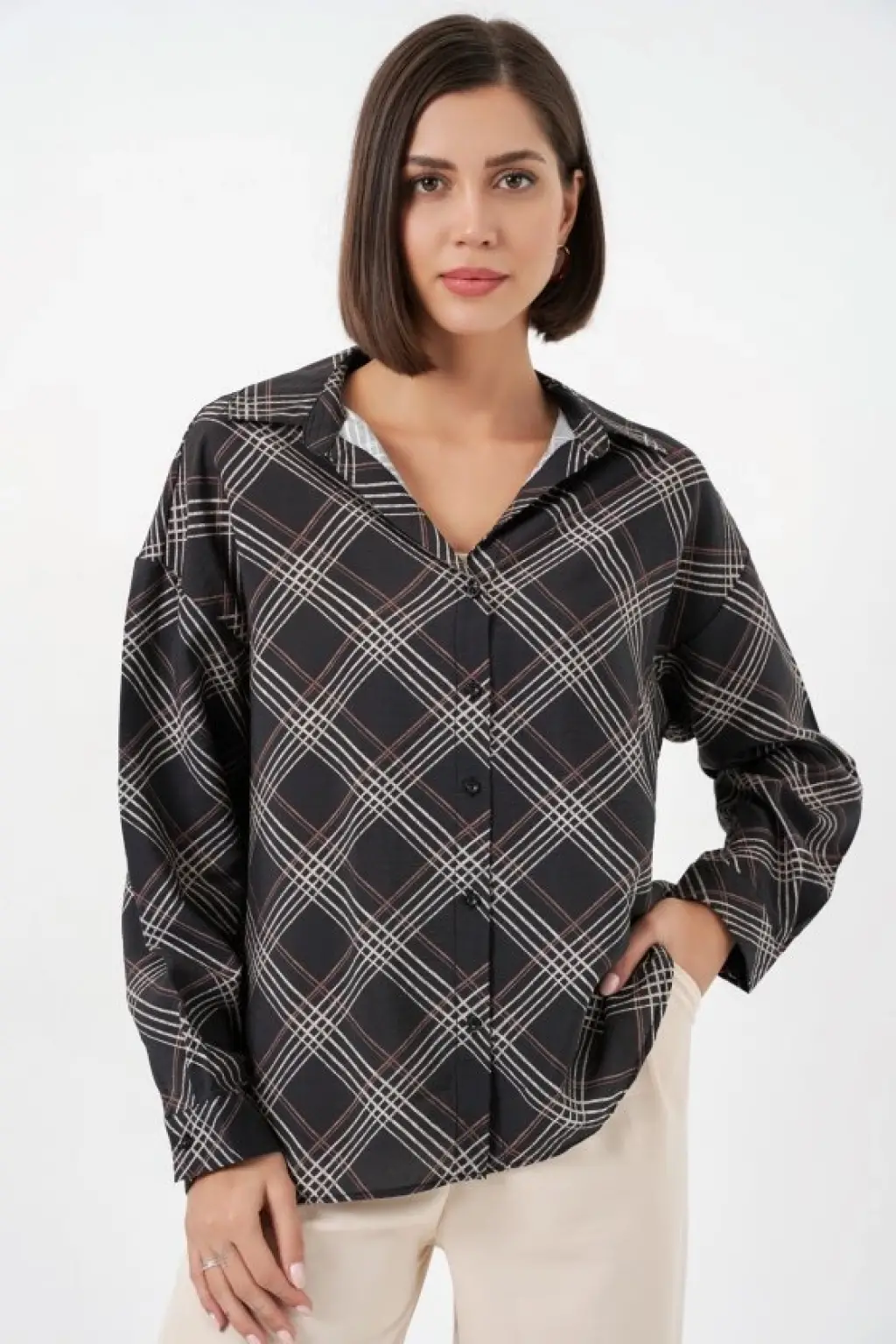 Oversize Desenli Gömlek 20372 - Kahverengi