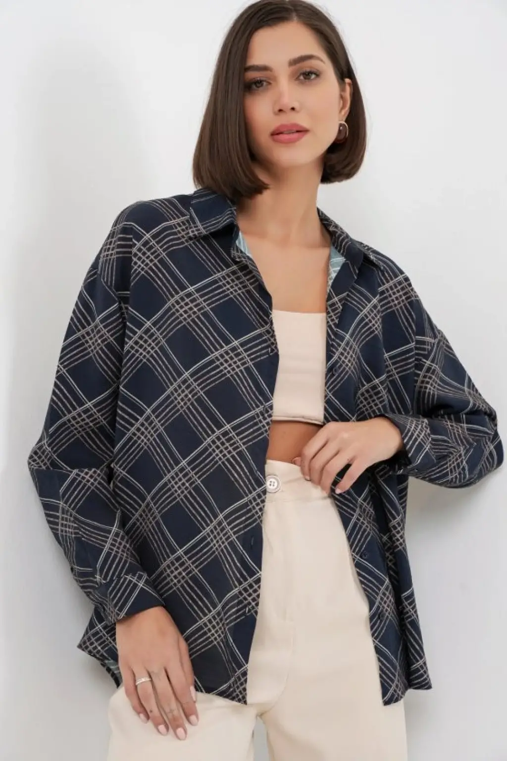 Desenli Oversize Viskon Gömlek 20371 - Mavi