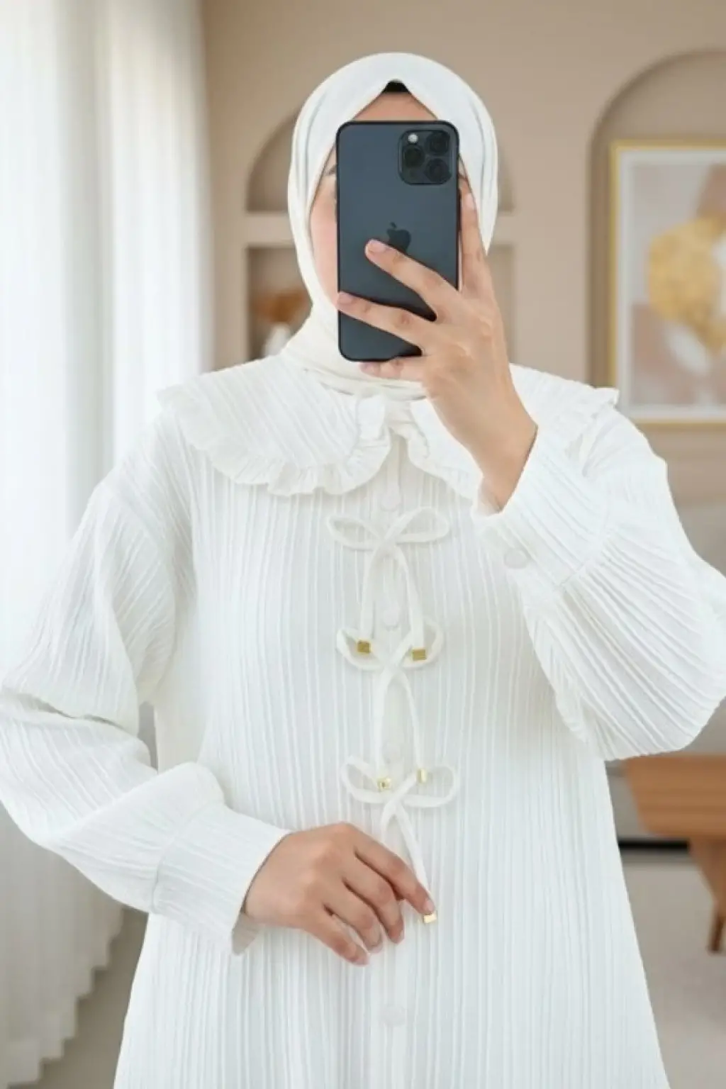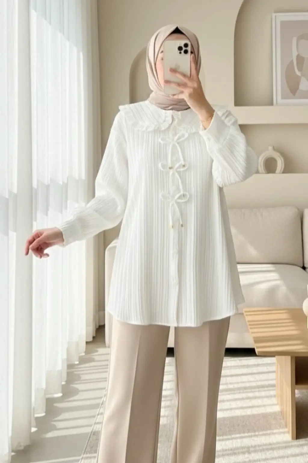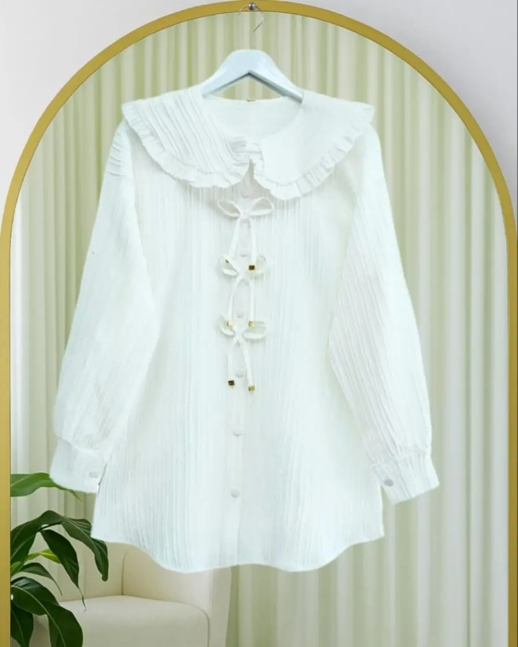 Önü Kurdele Detaylı Düğmeli Önlük Yaka Gömlek -Beyaz