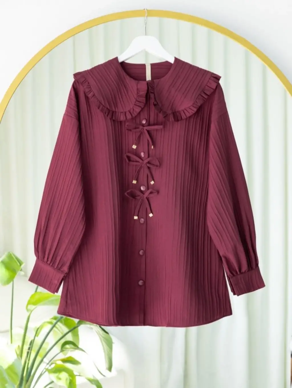 Önü Kurdele Detaylı Düğmeli Önlük Yaka Gömlek -Bordo