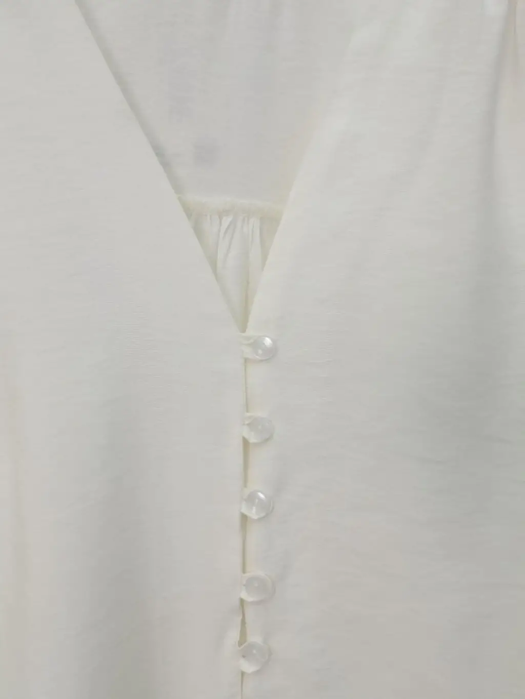 V Yaka Düğmeli Arkası Uzun Gömlek -Ekru