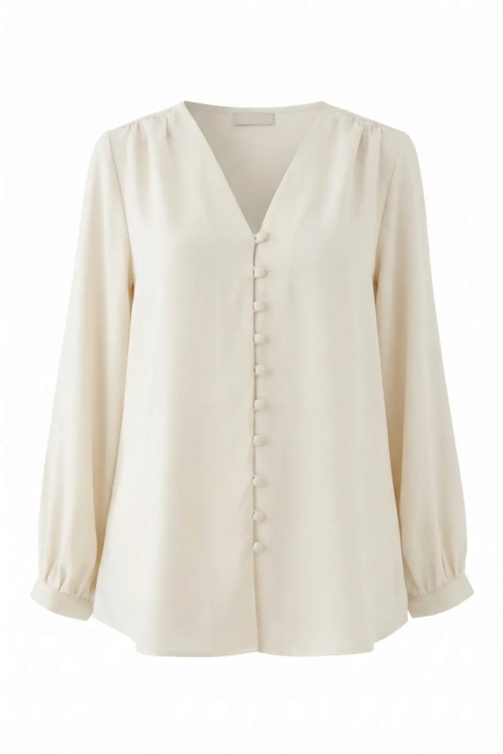 V Yaka Düğmeli Arkası Uzun Gömlek -Krem