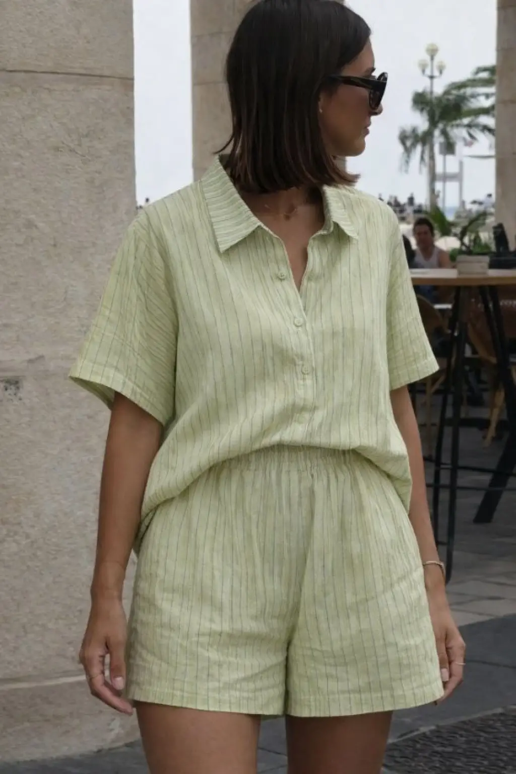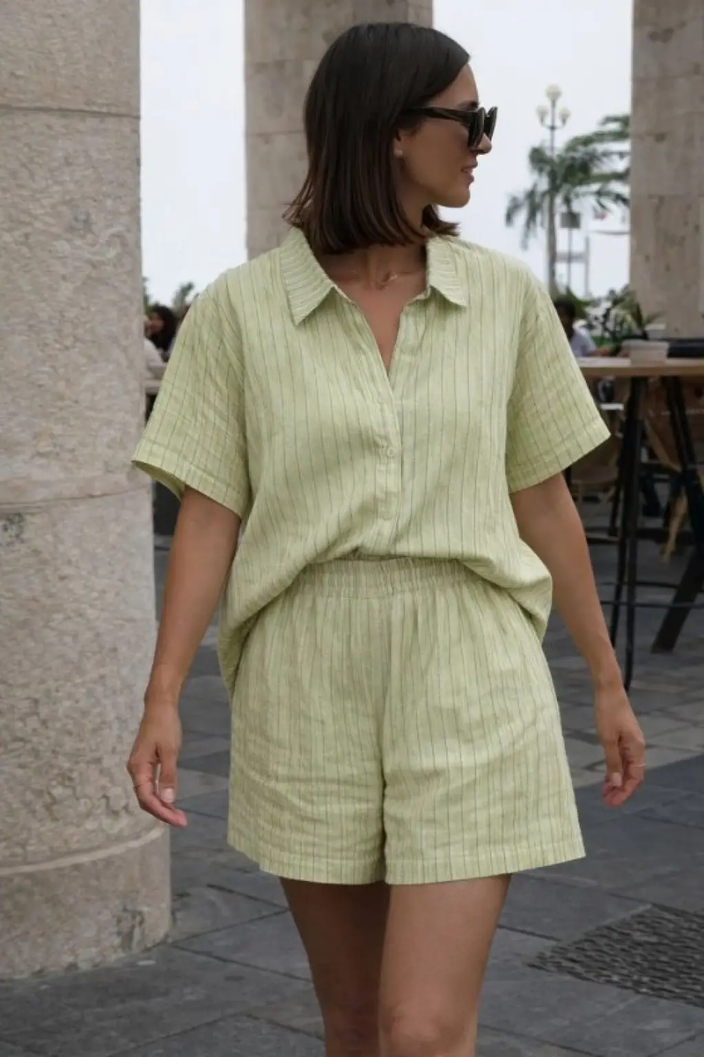 Kadın Kısa Kollu çizgili Modal Kumaş Gömlek Ve Yüksek Bel Lastik Detay şort Ikili Takım