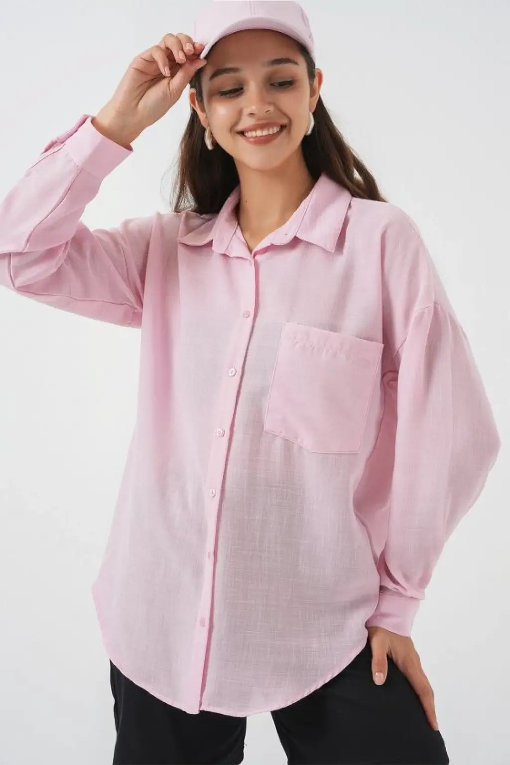 20153 Tek Cepli Oversize Keten Gömlek - A.Pudra