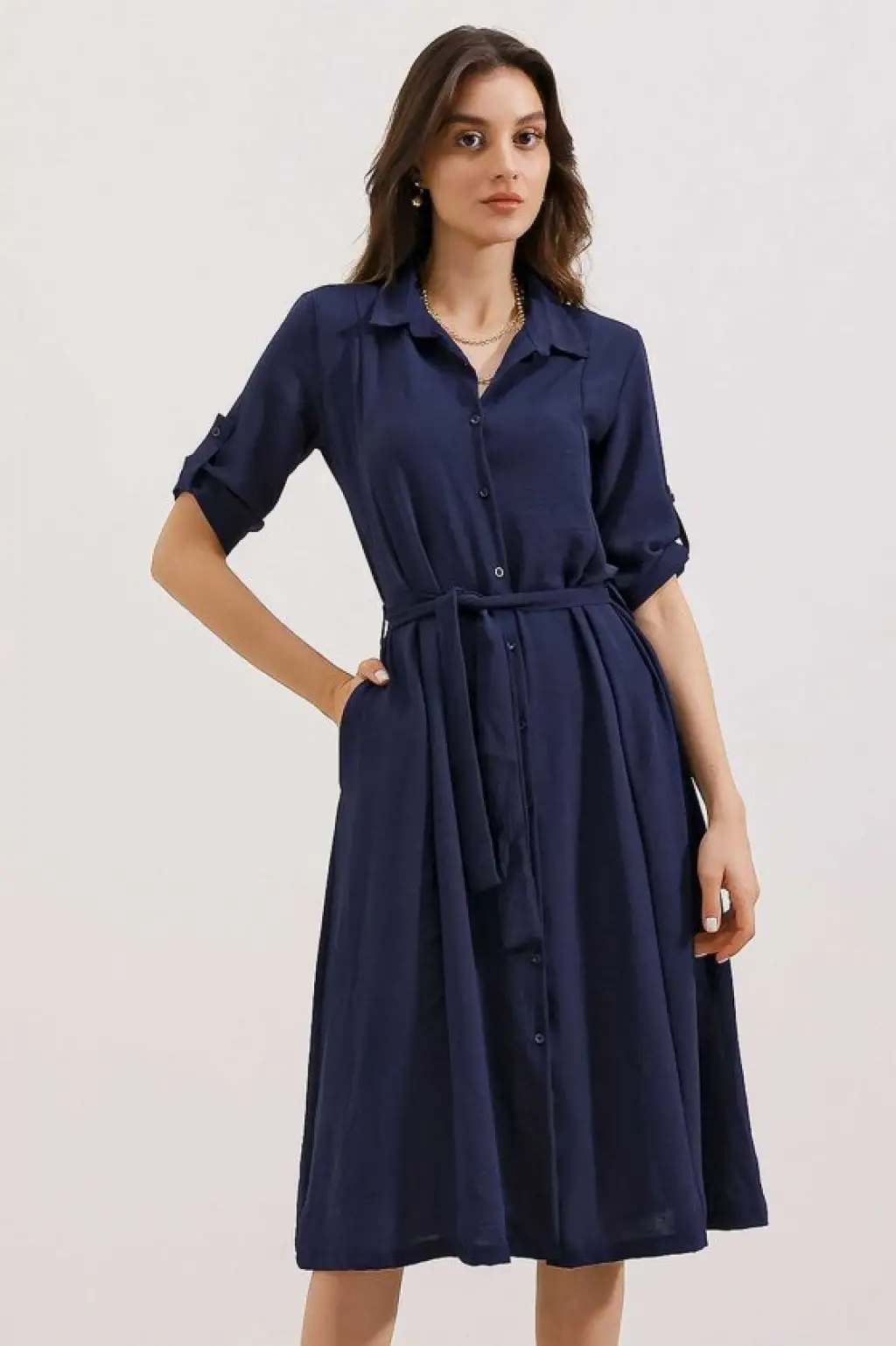 Lacivert Kuşaklı Gömlek Elbise 2442