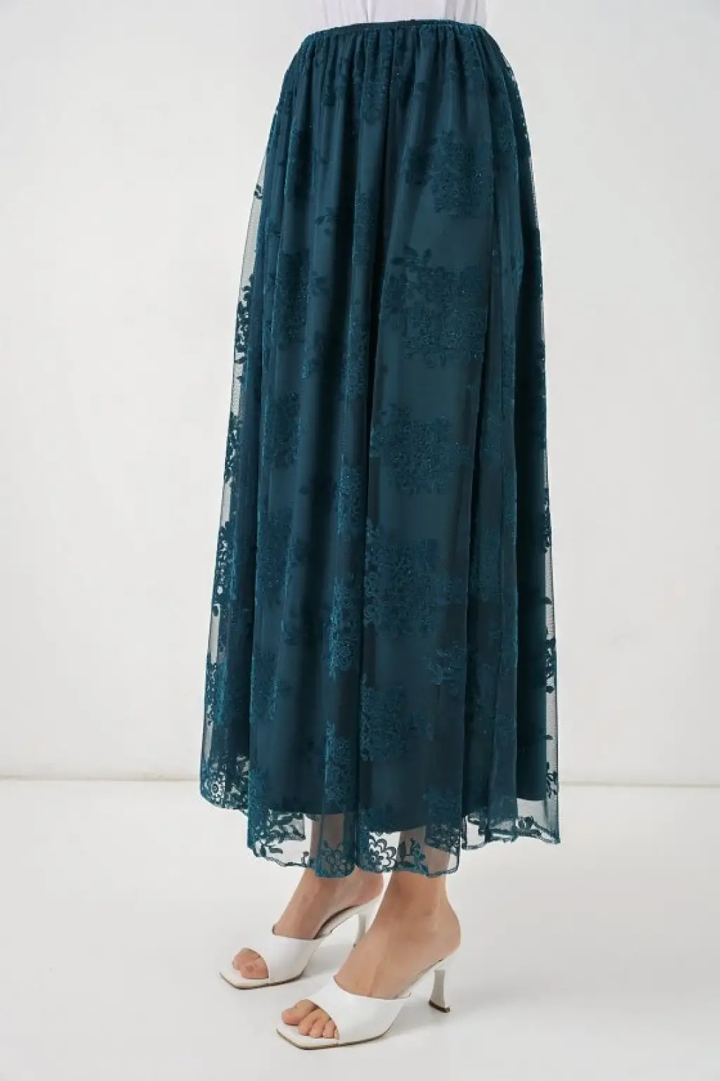 Flok Baskılı Uzun Tül Etek 8070 - Petrol