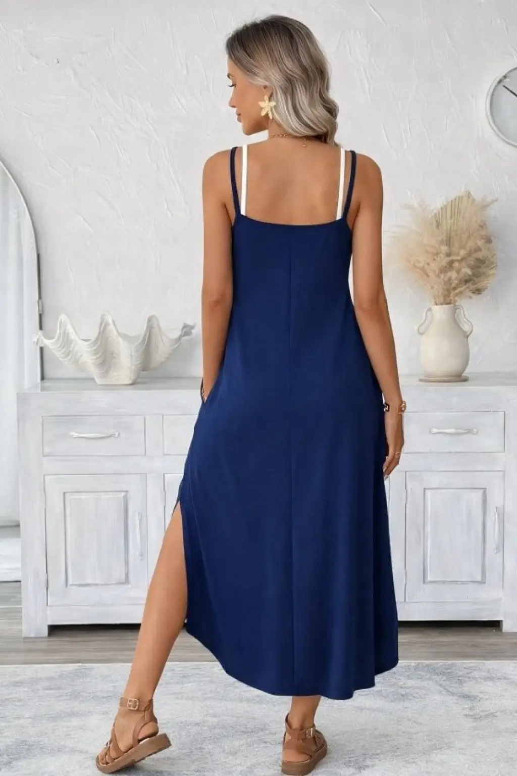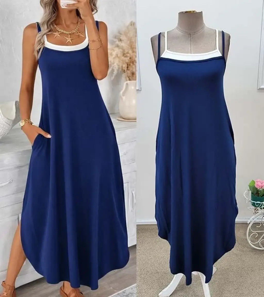 Kadın Ip Askılı Yuvarlak Yakalı Cepli Uzun Viskon Elbise