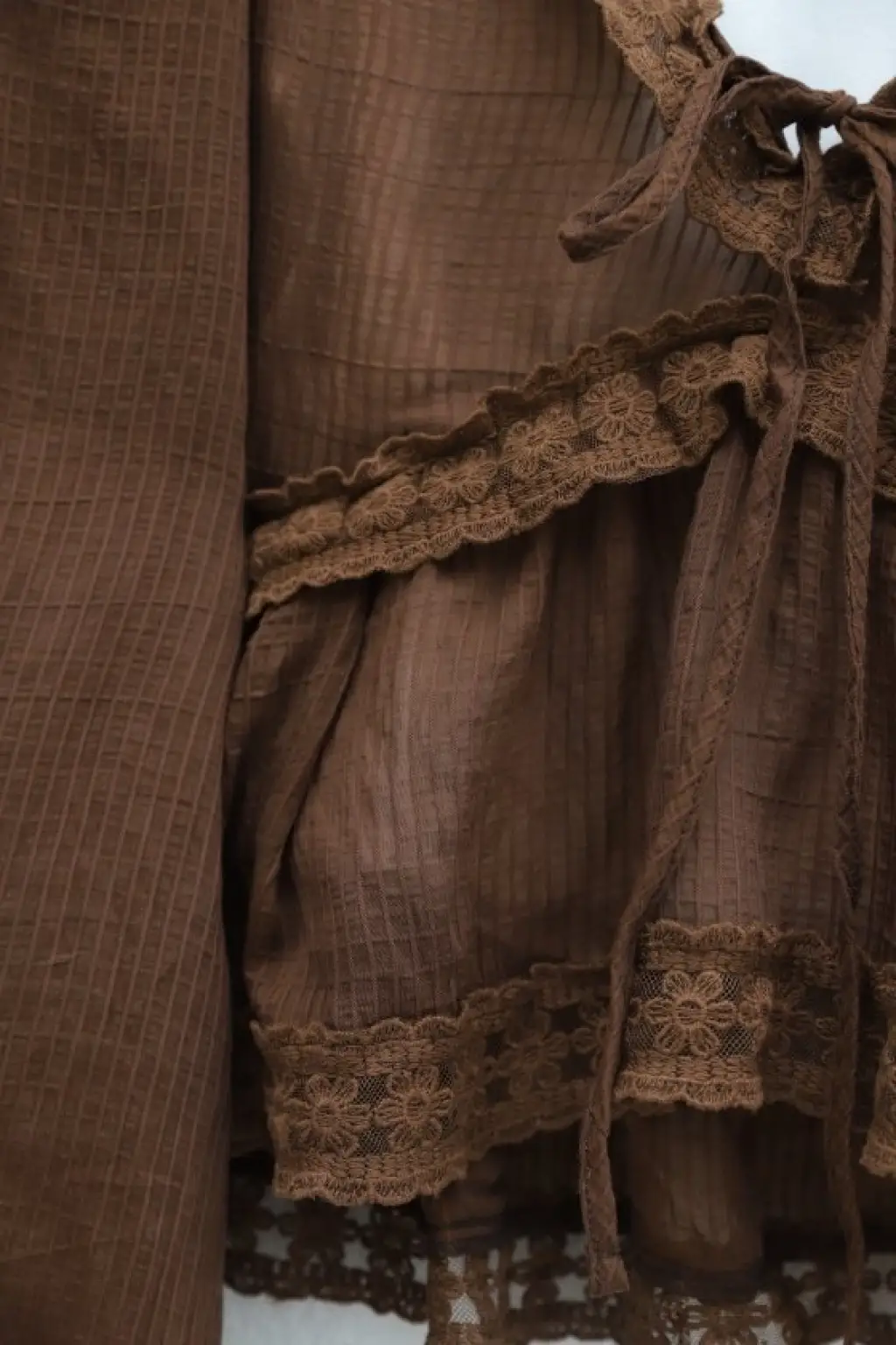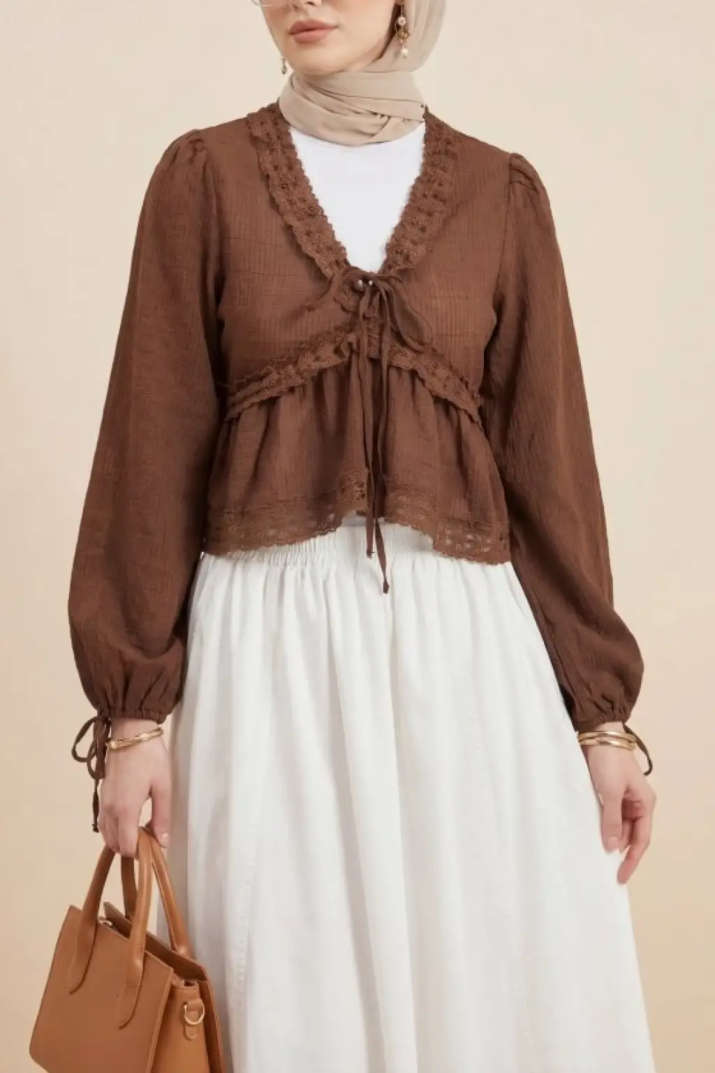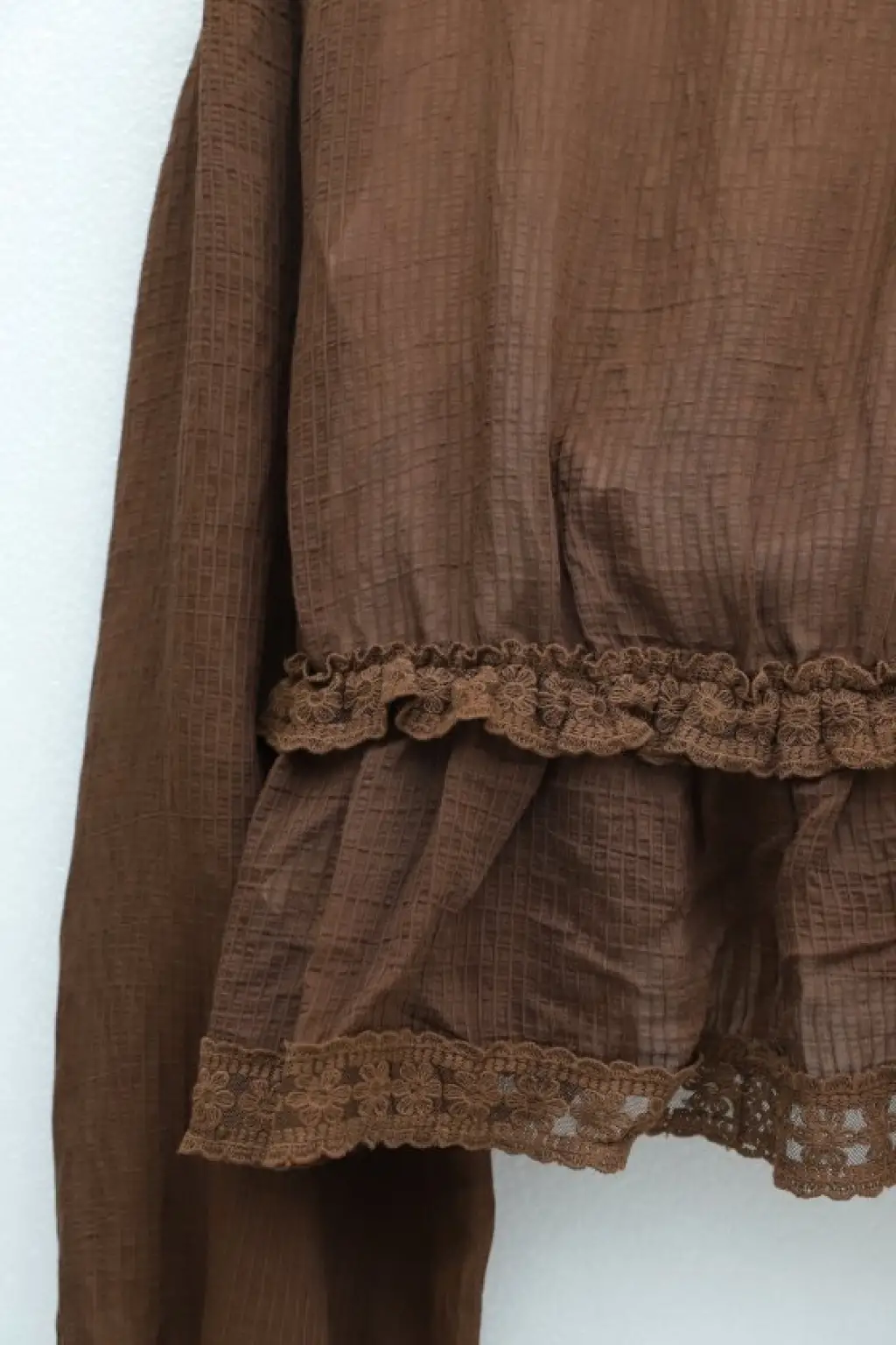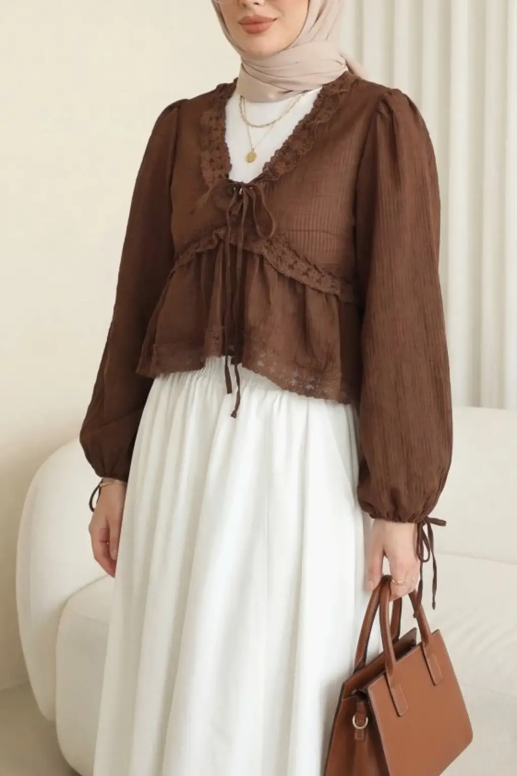 Fırfır Detaylı V Yaka Yarı Transparan Bluz -Kahve