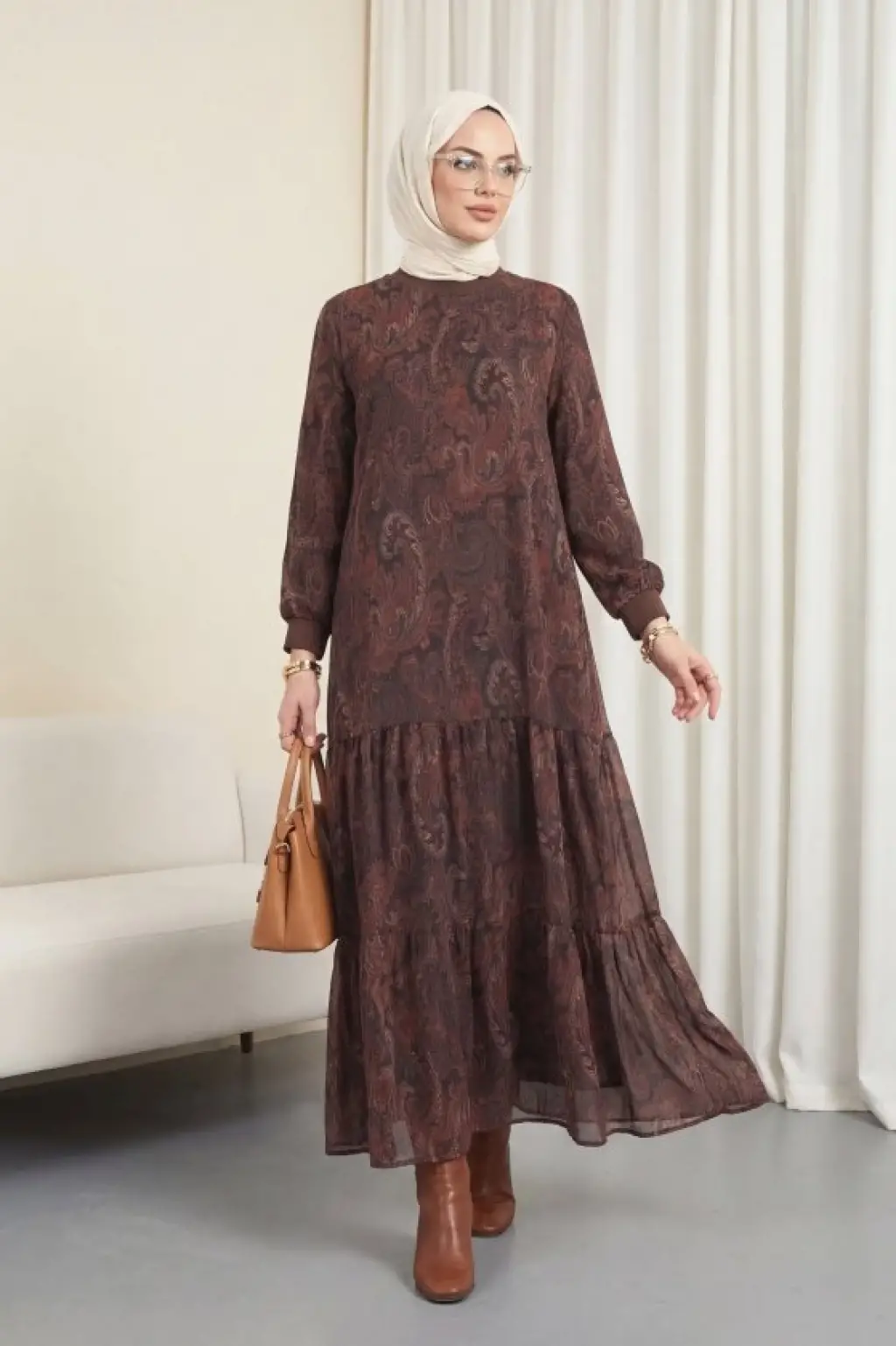 Etnik Desen Eteği Parçalı Astarlı Şifon Elbise -Açık Kahve