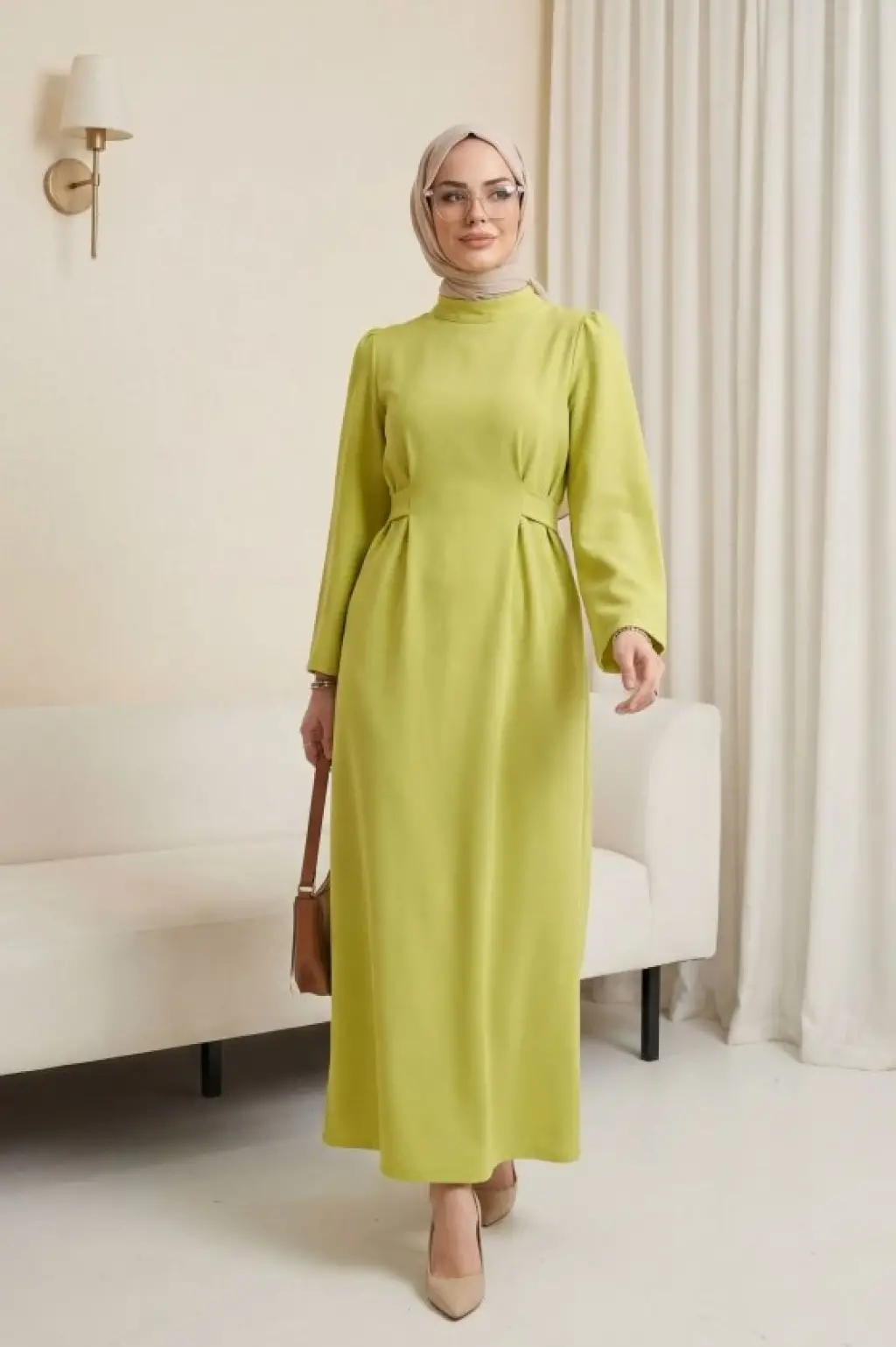 Hakim Yaka Belden Bağlamalı Elbise -Yağ Yeşili