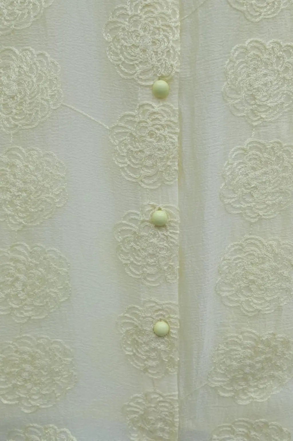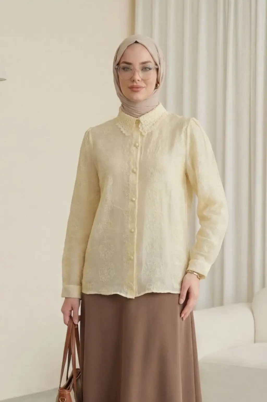 Top Düğmeli Yakası Dantelli Desenli Jakar Gömlek -Bej
