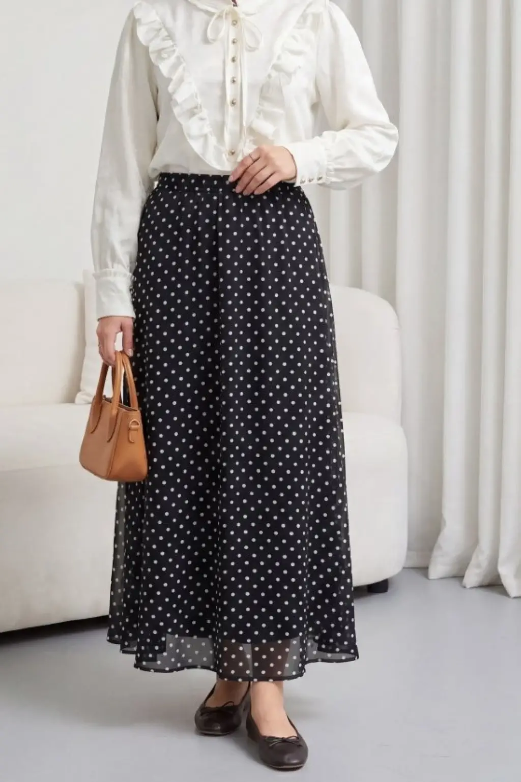 Puantiyeli Beli Lastikli Astarlı Şifon Etek -Siyah