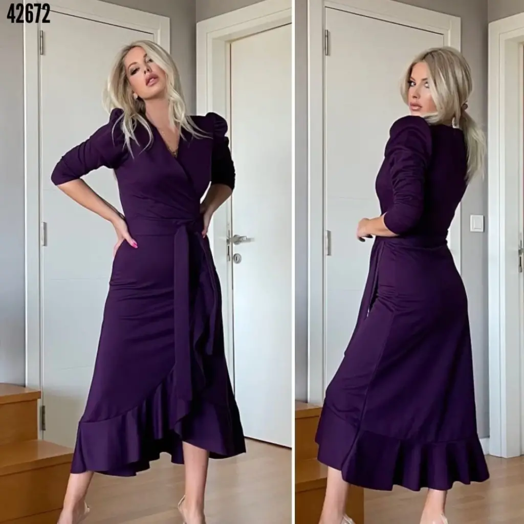 Krep Kumaş Midi Boy Kuşaklı Uzunkol Elbise