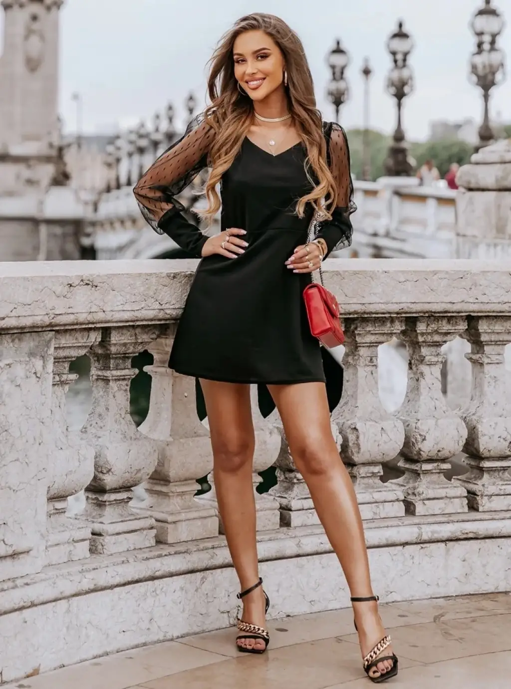 Kadın V Yaka Tül Detaylı Uzun Kollu Elbise