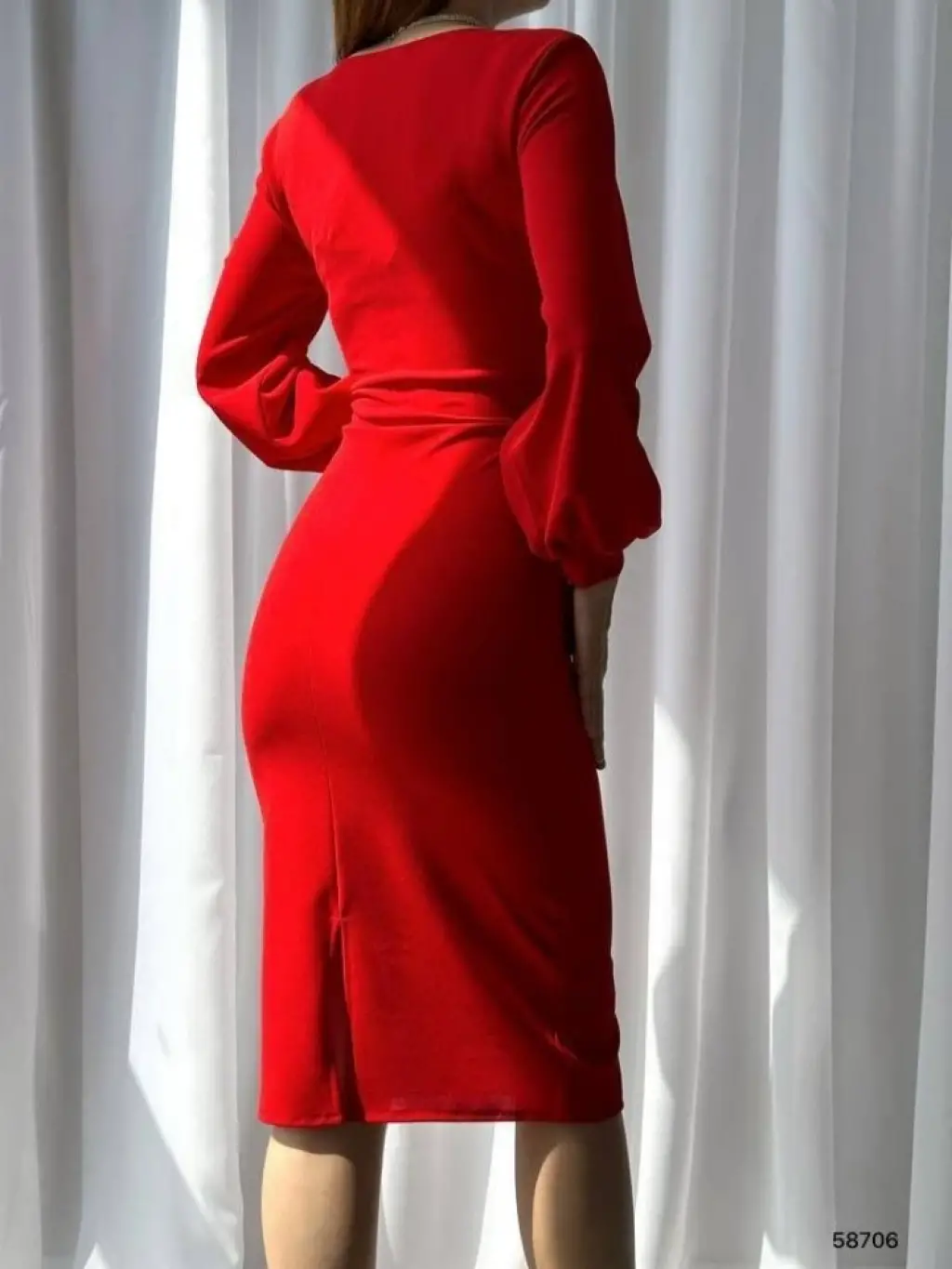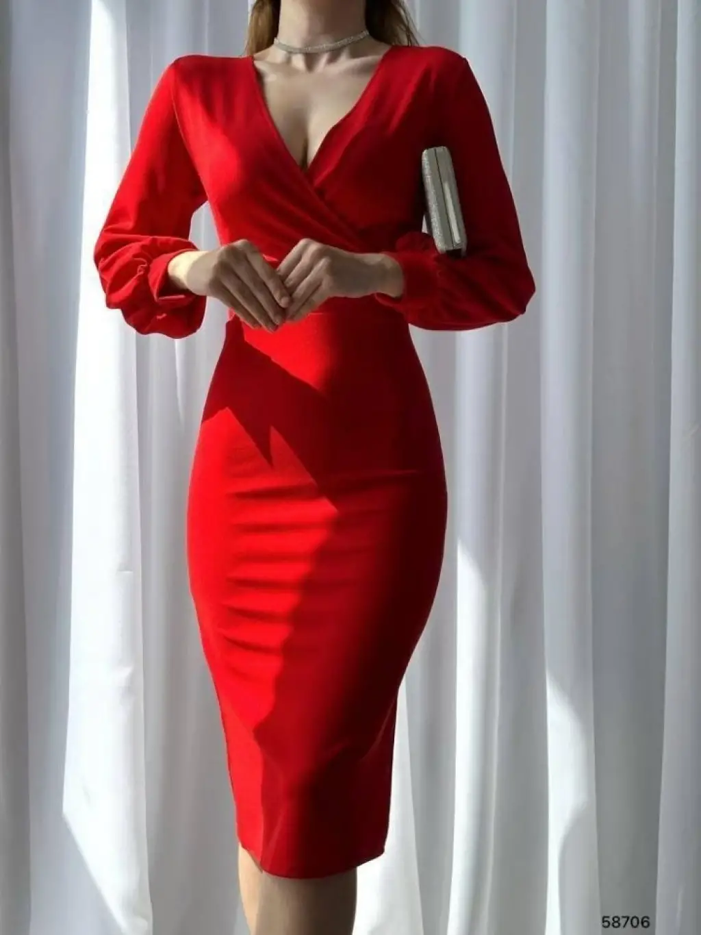 Kadın Kruvaze Yaka Balon Kol Midi Boy Elbise
