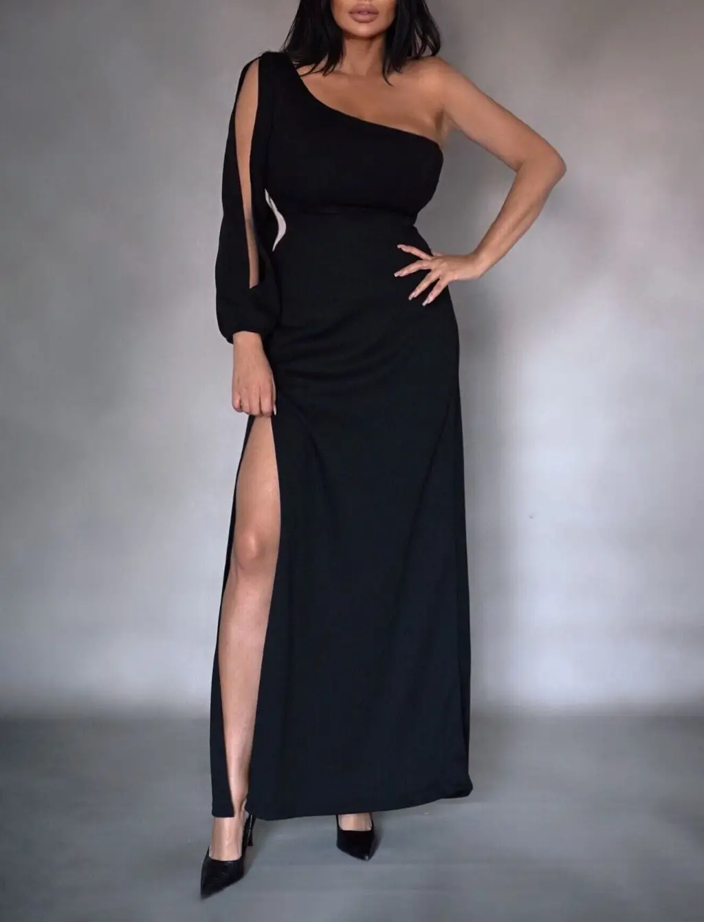 Tek Omuz Açık Derin Yırtmaçlı Krep Tam Boy Elbise