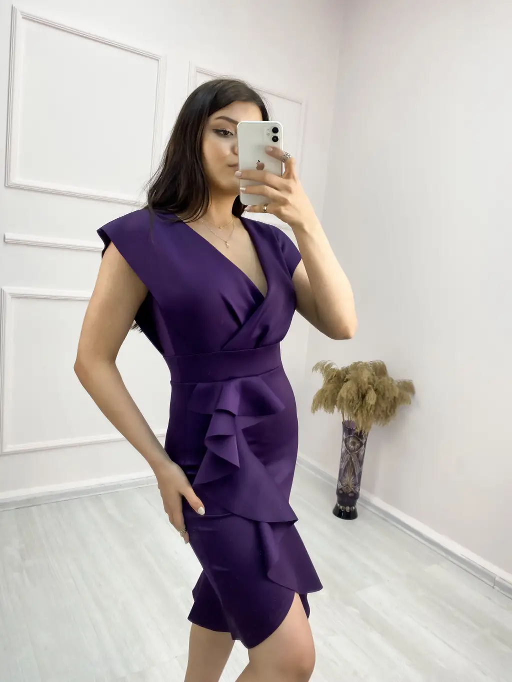 Kadın Askılı Kruvaze Yakalı Fırfırlı Janjan Krep Elbise