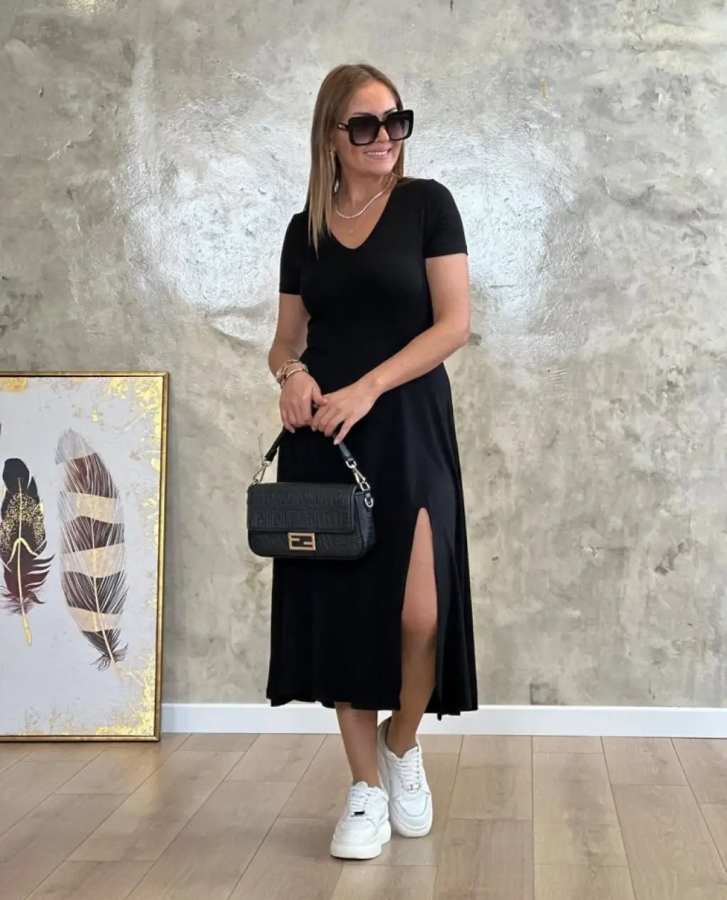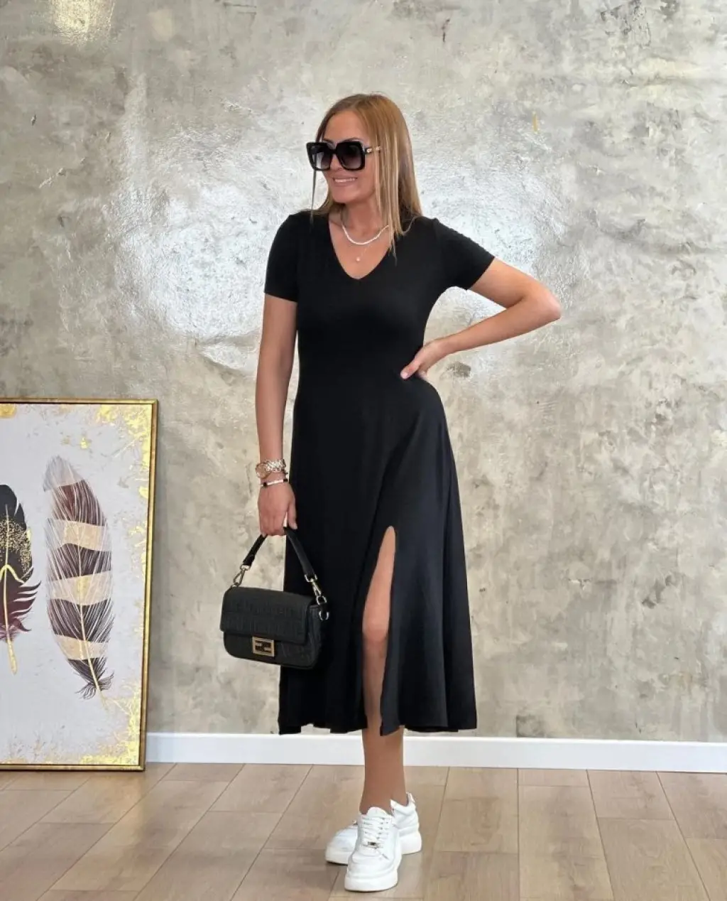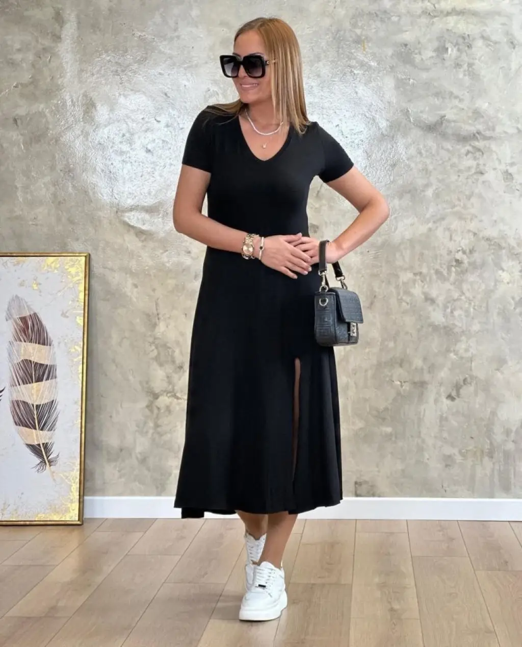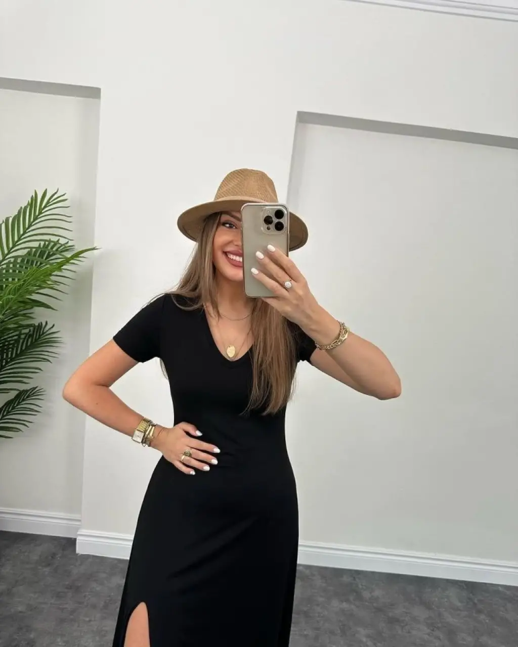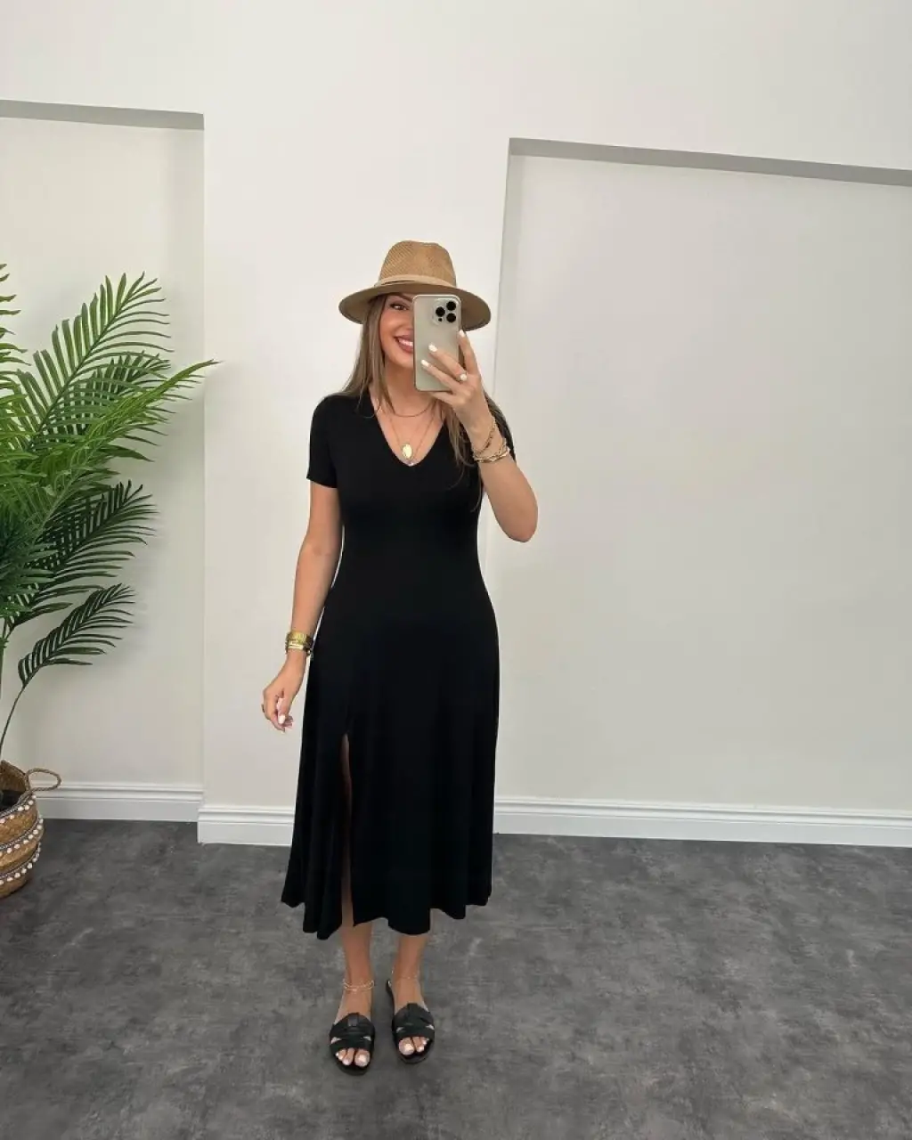 Kadın Kısa Kollu V Yaka Maxi Boy Elbise 124 Cm