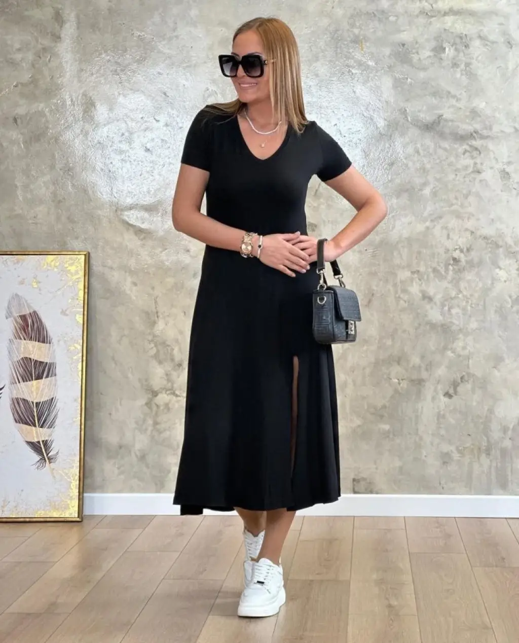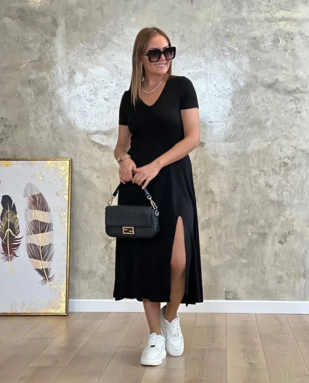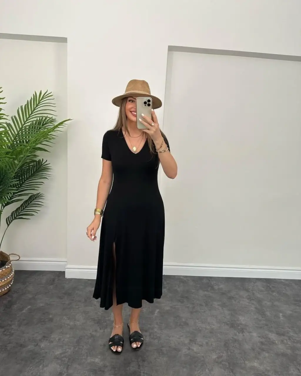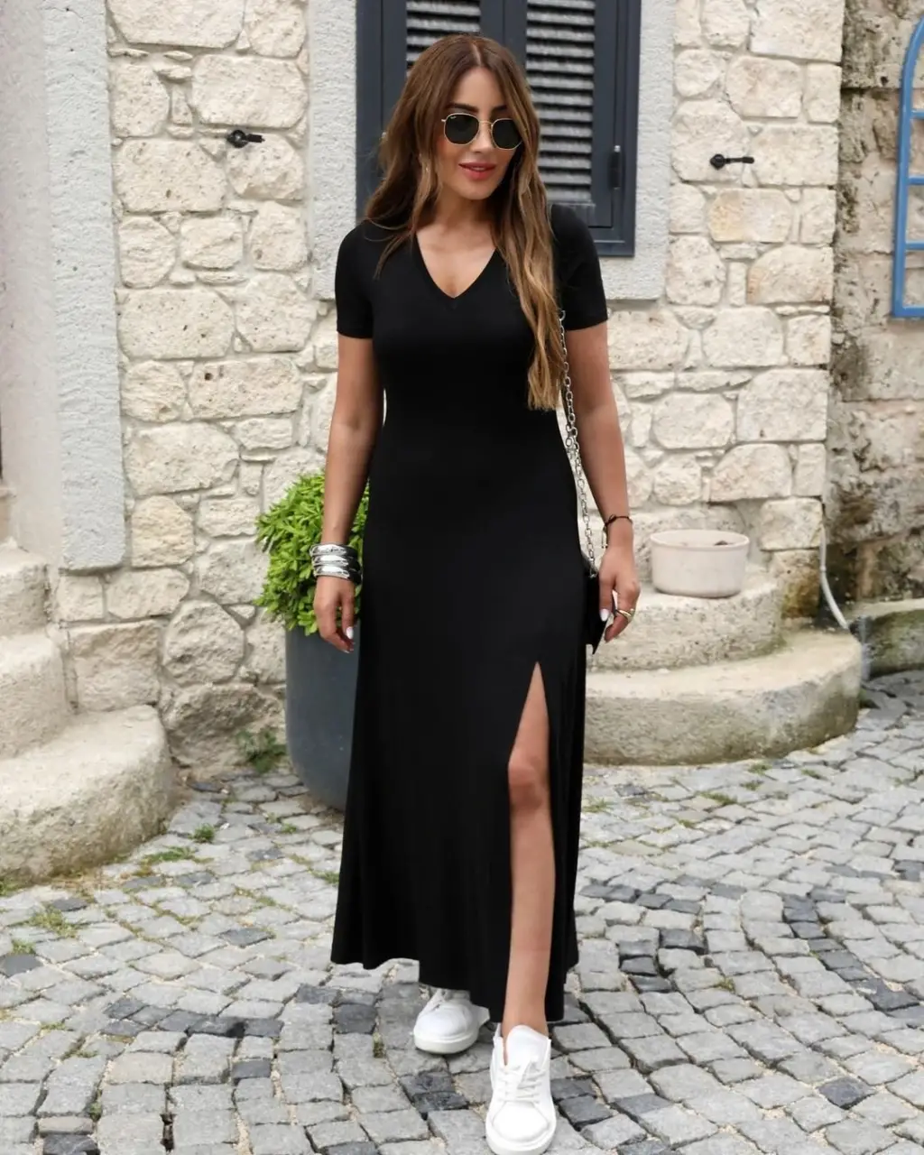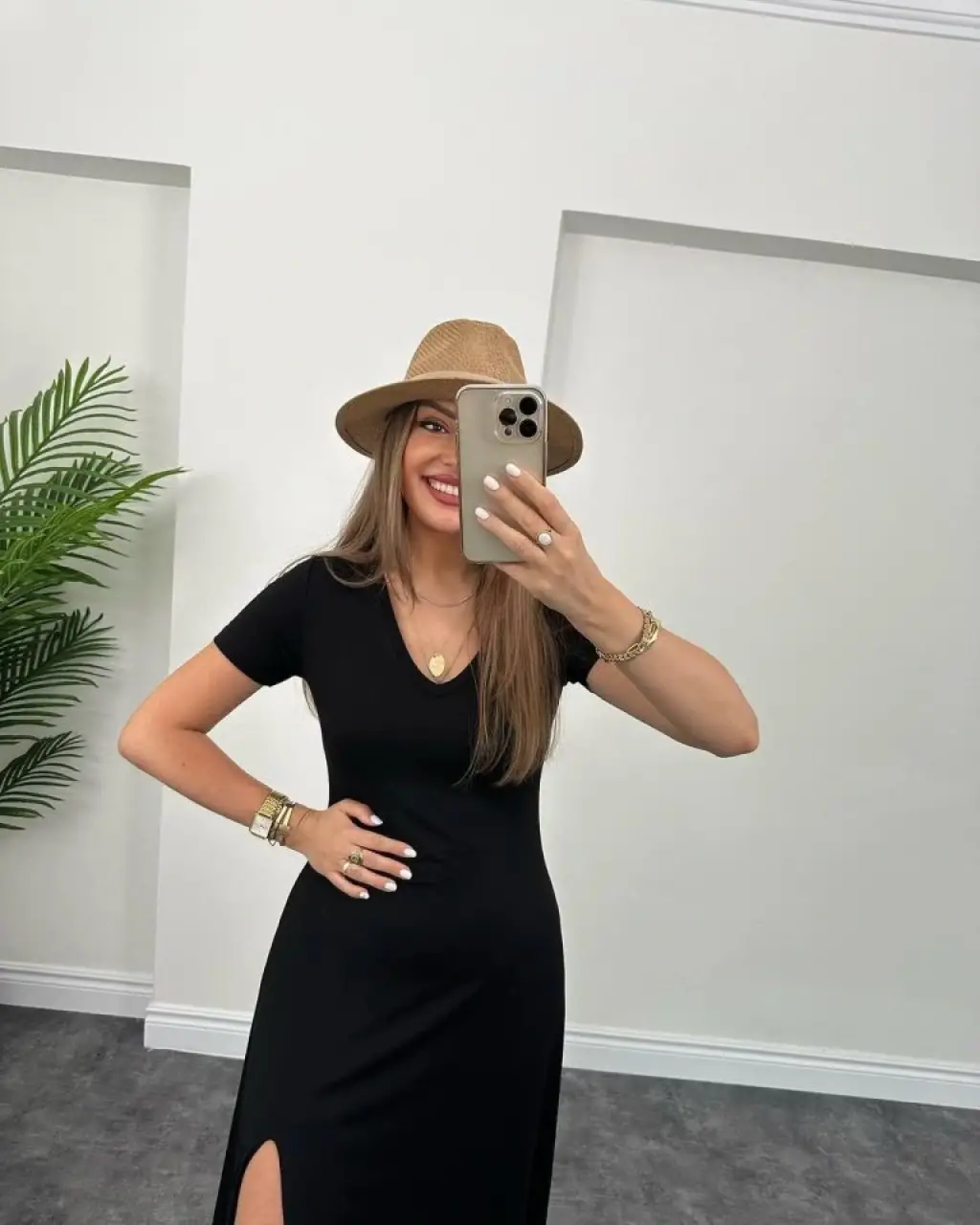Kadın Uzun Kollu V Yakalı Yandan Yırtmaçlı Iki Iplik Midi Elbise