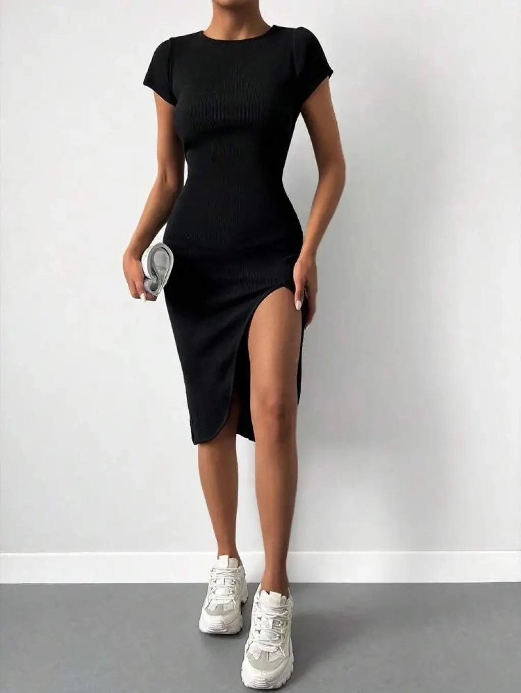 Kadın Kısa Kollu Bisiklet Yaka Derin Yırtmaçlı Kaşkorse Elbise