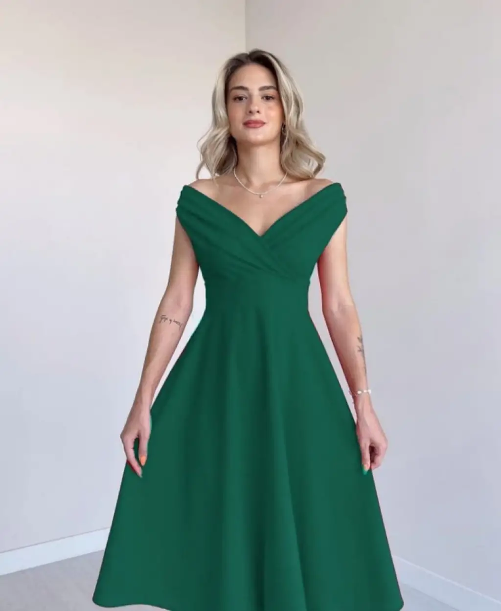 Kadın Kısa Kollu Madonna Yaka önü Kısa Arkası Uzun Ithal Krep Elbise
