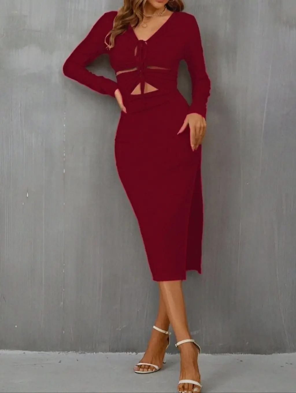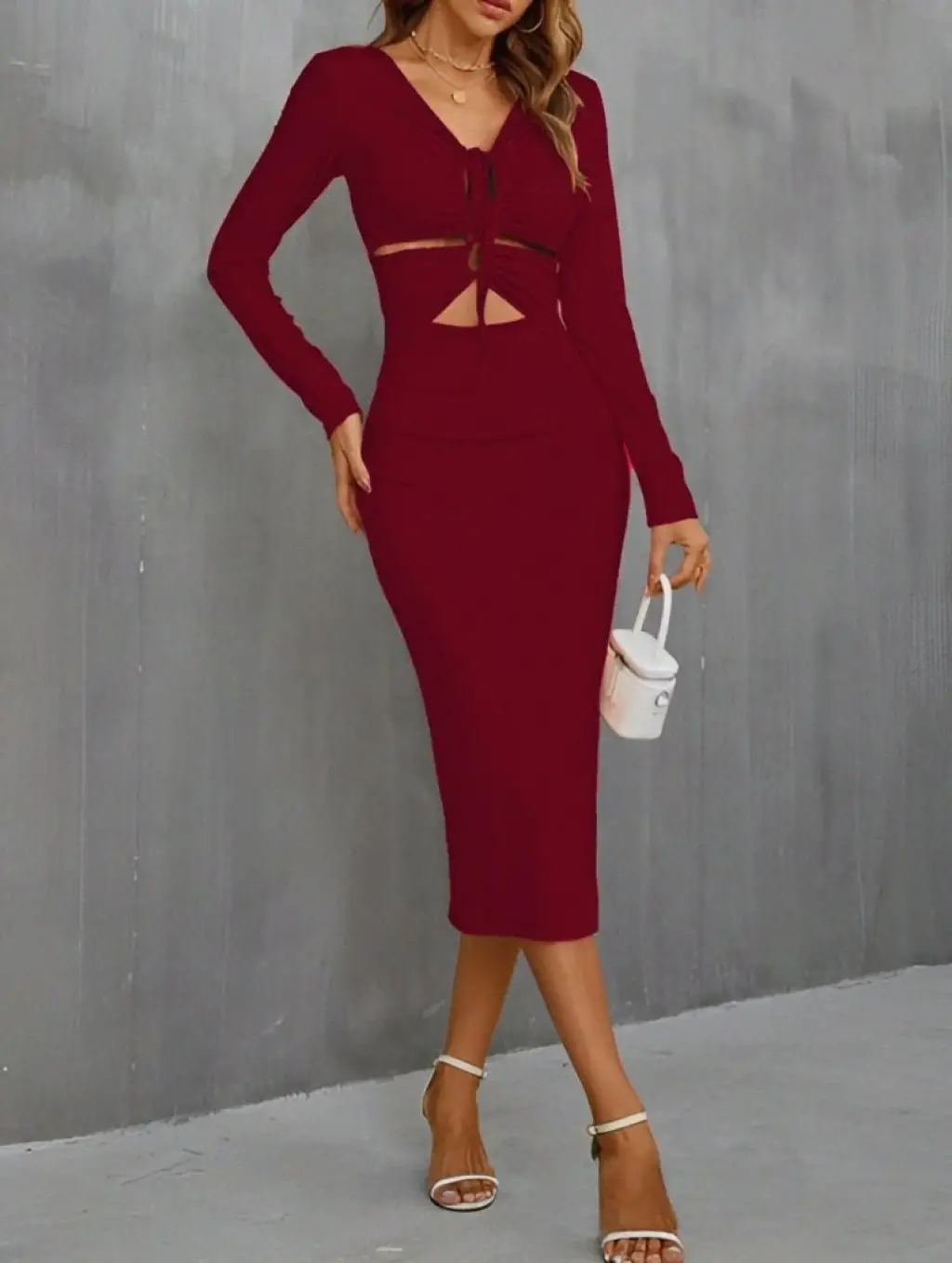 Kadın Uzun Kollu Göğüs Ve Göbek Dekolte Detay Sandy Midi Boy Elbise