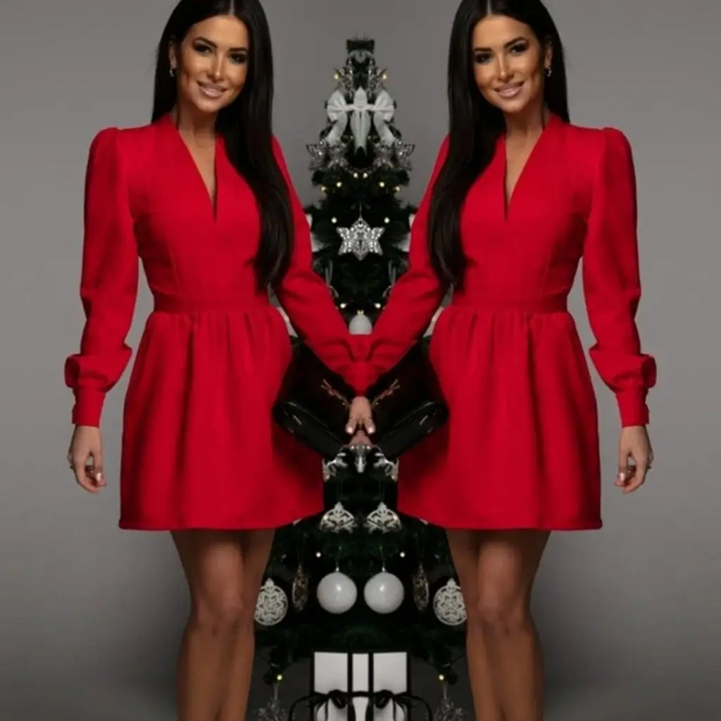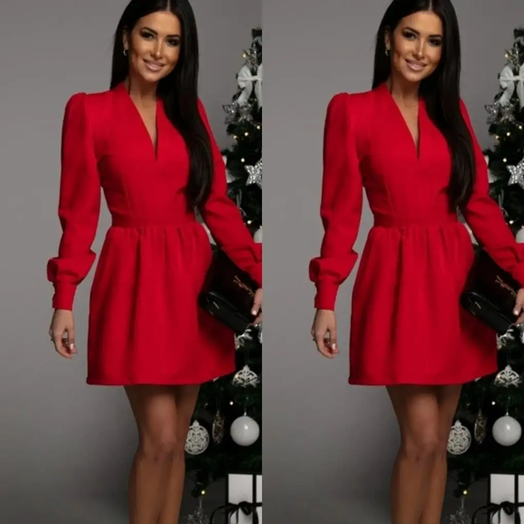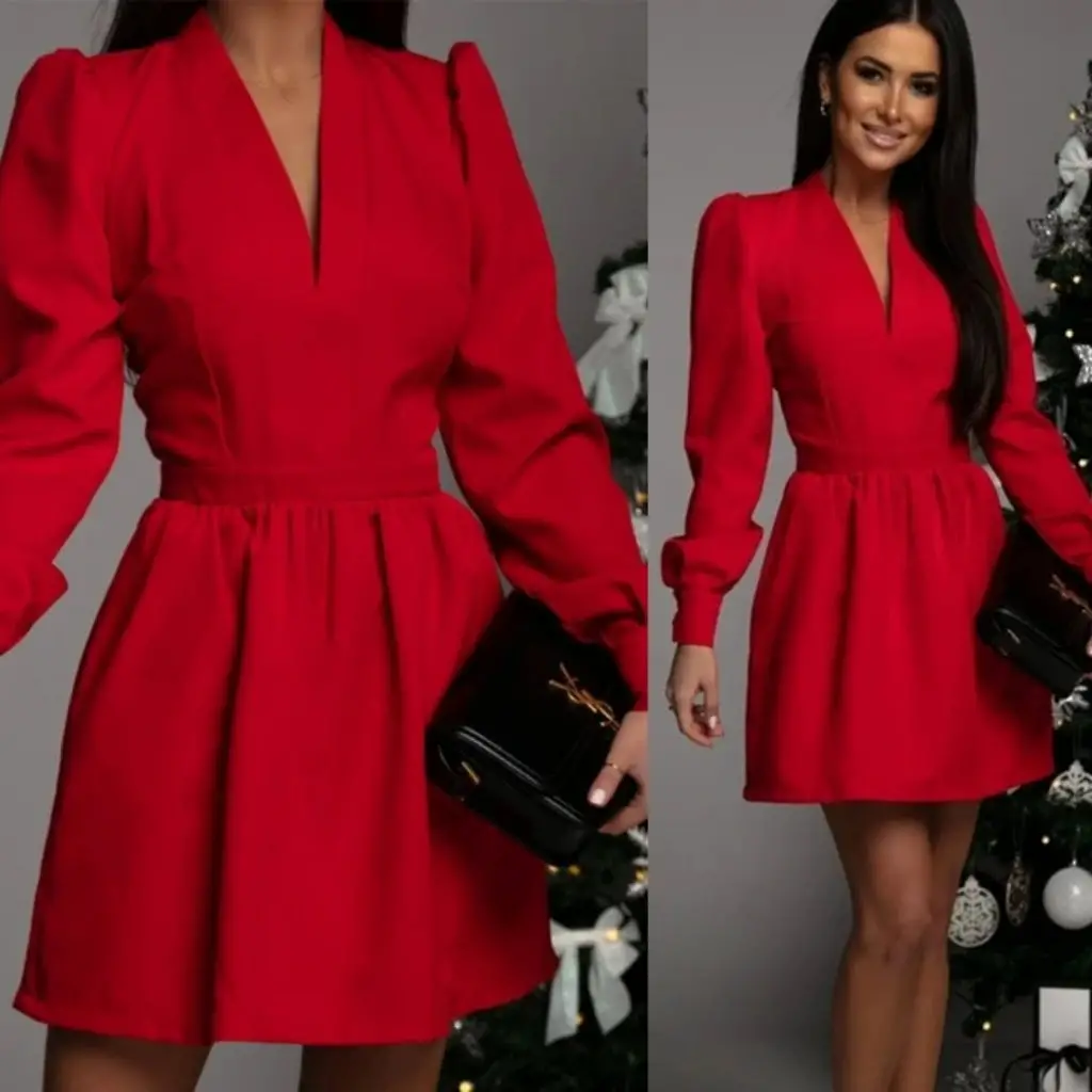 Kadın Uzun Kollu V Yaka Belden Hafif Pileli Scuba Krep Mini Boy Elbise