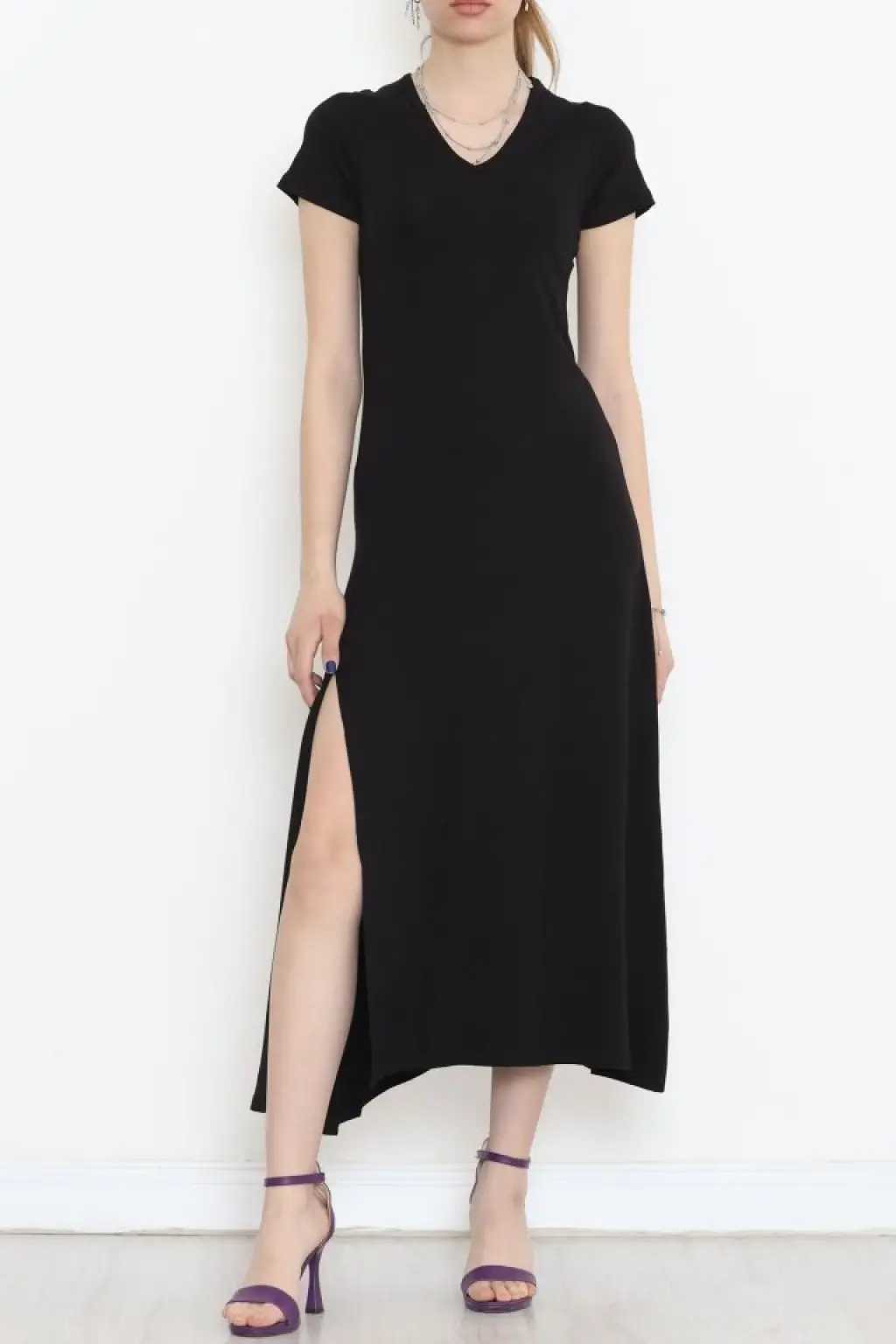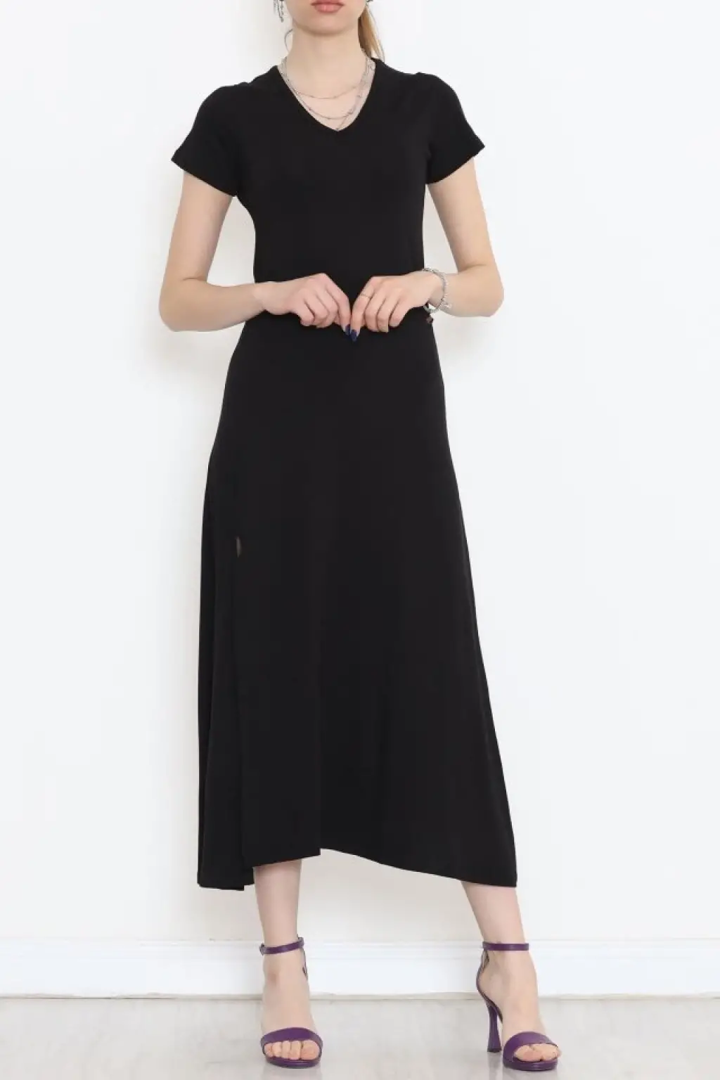 Kadın Kısa Kollu Balıkçı Yaka Derin Yırtmaç Detay Viskon Elbise