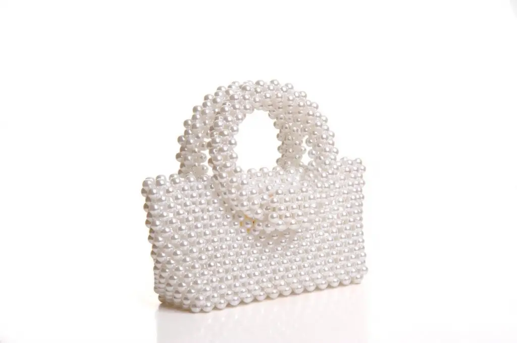 zarif ve şık tasarımıyla öne çıkan incili el yapımı yuvarlak kol çantası, şıklığı ve şıklığı bir arada sunuyor.