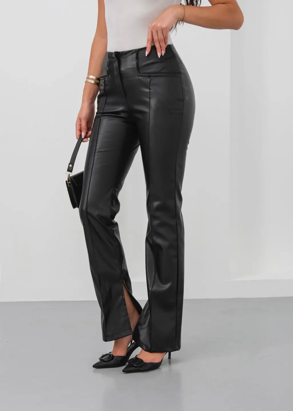 İspanyol yırtmaçlı paça deri pantolon siyah hn