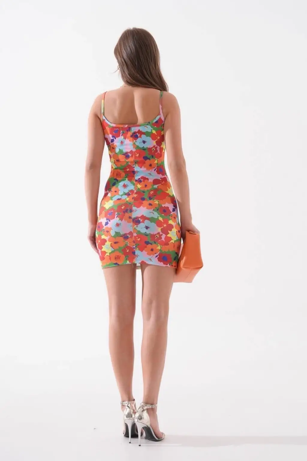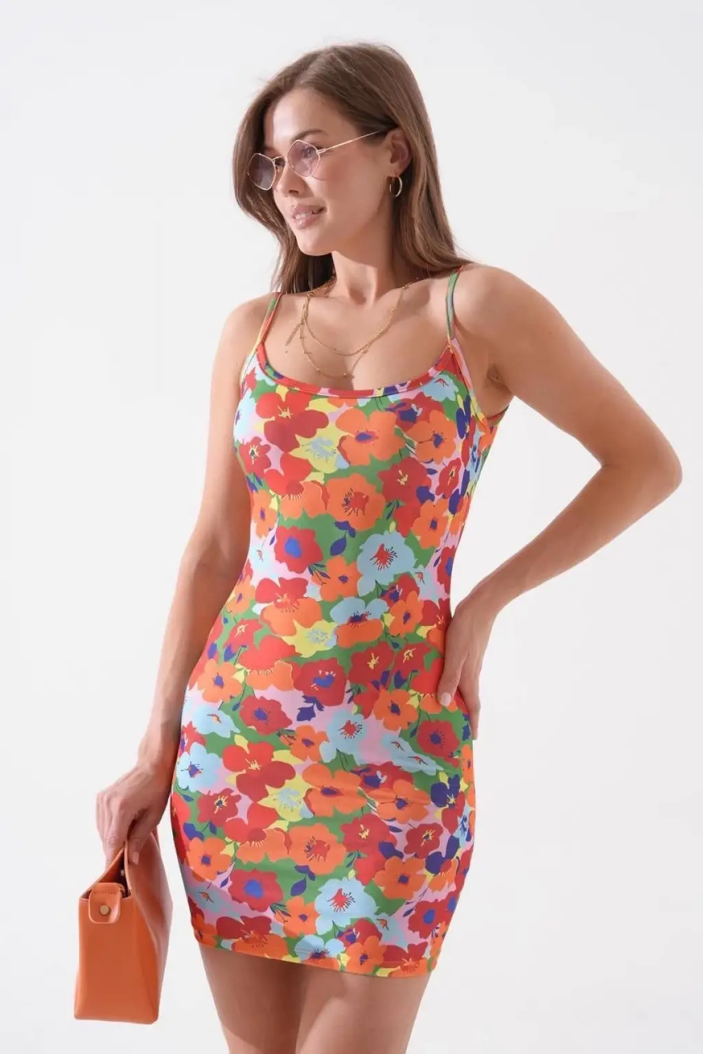 S8105 modeli ince askılı desenli elbise, özgün tasarımı ile şıklığı ve konforu bir arada sunuyor.