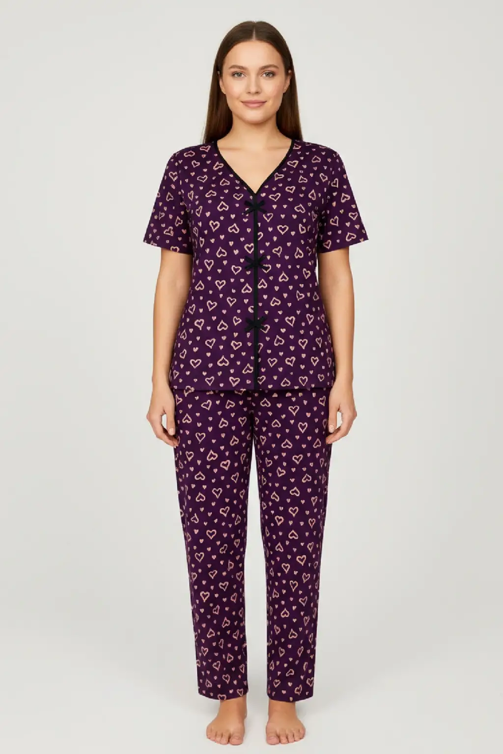 Canlı mor rengiyle dikkat çeken pijama takımı, beyaz kalp desenleri ve ön kısmındaki fiyonk detaylarıyla romantik bir görünüm oluşturur.