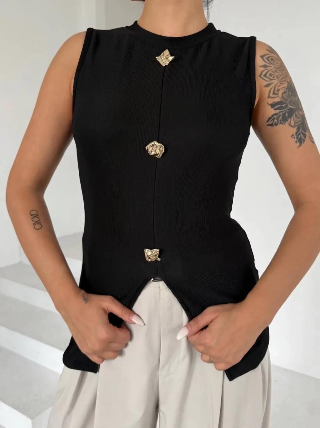 Bisiklet yaka tasarımıyla modern bir hava katan bluz, gold düğmeleriyle de göz alıcı bir detay sunuyor.