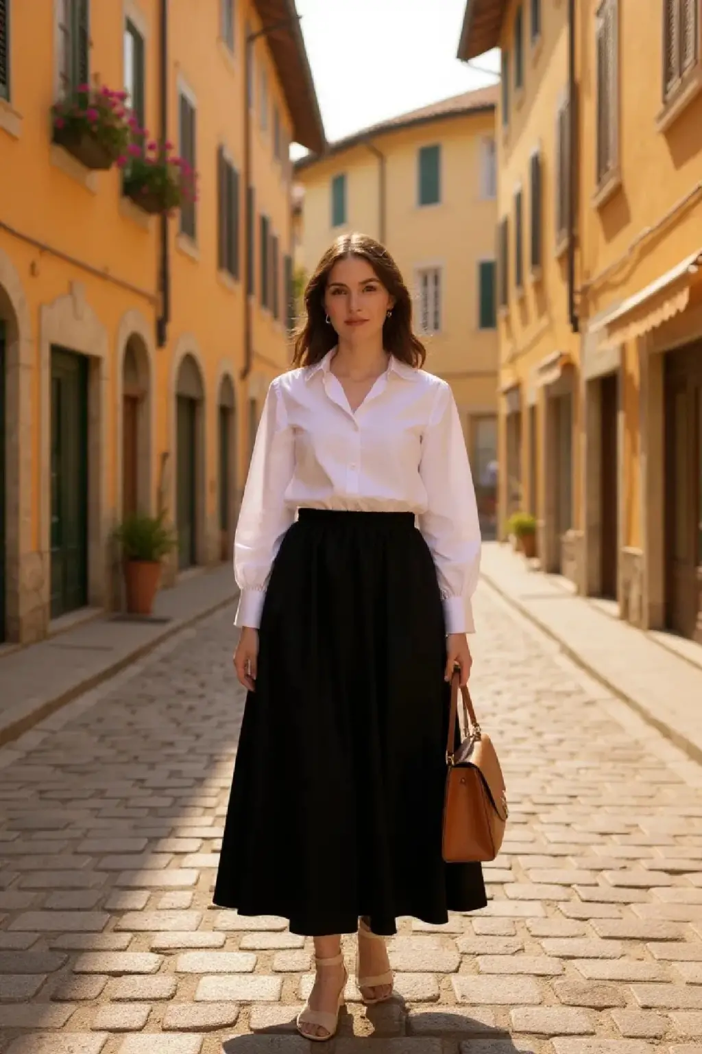 Klasik & Şık Kombin: Siyah eteği beyaz uzun kollu gömlek, ipek şal ve topuklu ayakkabı ile kombinleyerek davetlerde sofistike bir görünüm elde edebilirsiniz.
