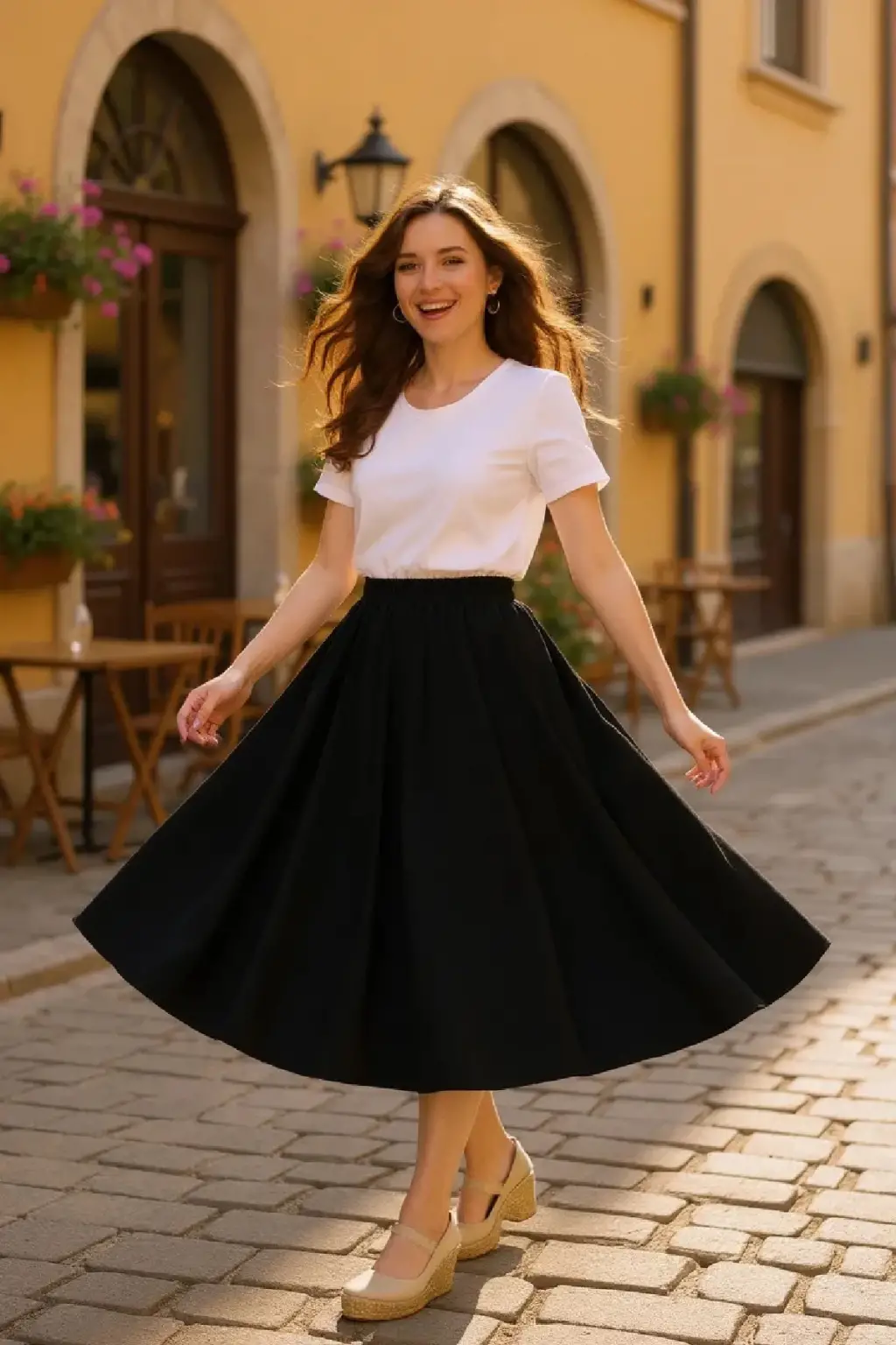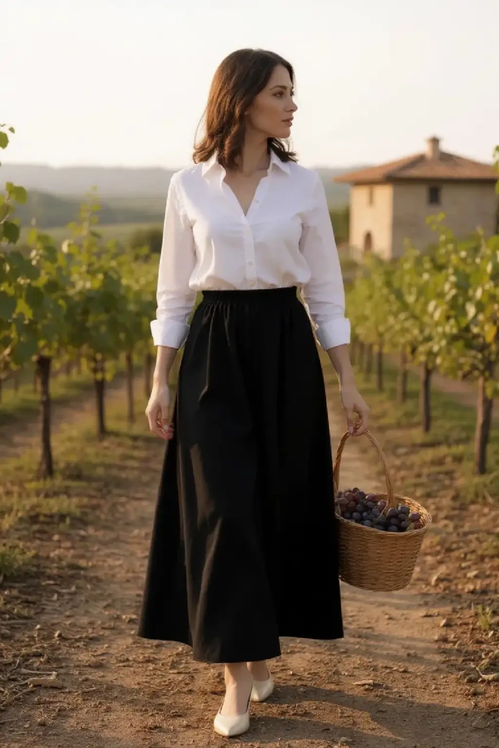 Minimalist Tarz: Siyah eteği bej tonlarında uzun gömlek, sade bir şal ve düz babetlerle tamamlayarak zahmetsiz bir şıklık oluşturabilirsiniz.