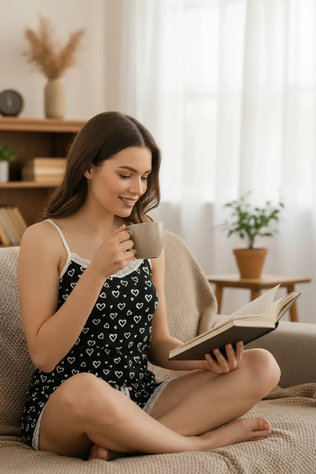 Zarafeti ve rahatlığı bir araya getiren Kadın Siyah Kalp Desenli Askılı Şortlu Dantelli Pijama Takımı, ev şıklığını yeniden tanımlıyor.
