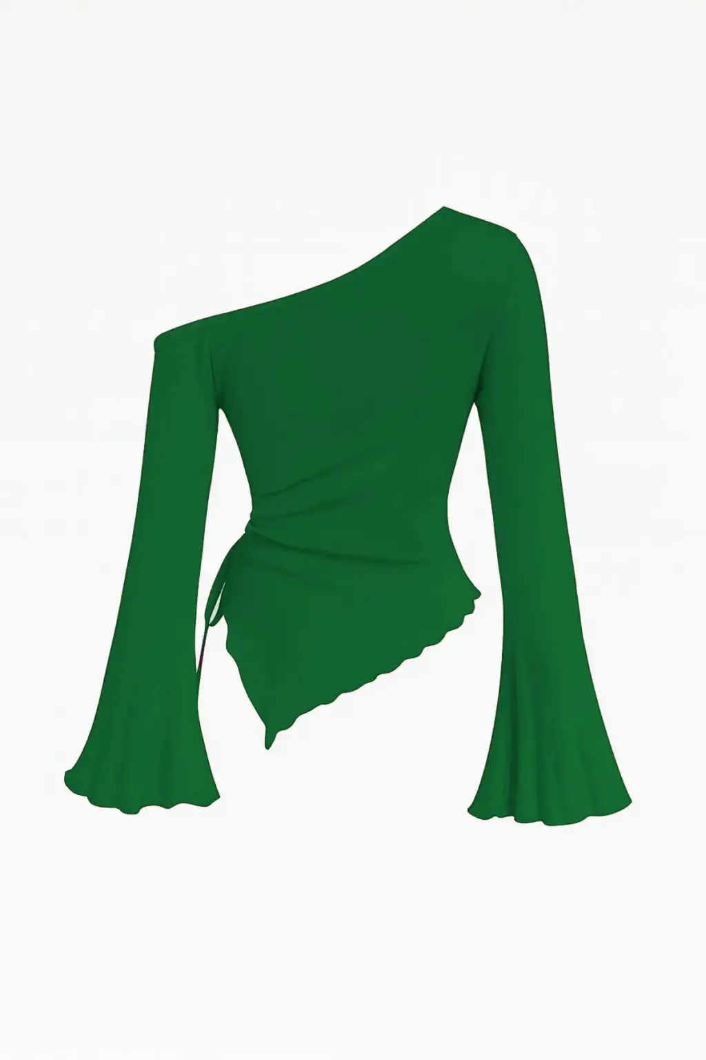 Asimetrik yakası omuz hattını zarifçe öne çıkarırken, yan bağlama detayı vücuda oturan formu destekler ve dengeli bir siluet oluşturur.
