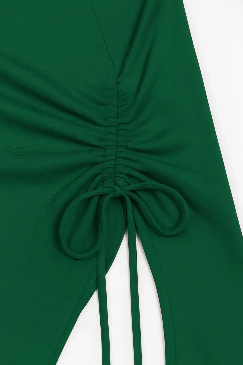 Modern çizgilerle tasarlanmış Kadın Yeşil Asimetrik Yaka Drapeli Yan Bağlamalı Uzun Kollu Bluz, doğadan ilham alan tonuyla sofistike bir zarafet sunar.