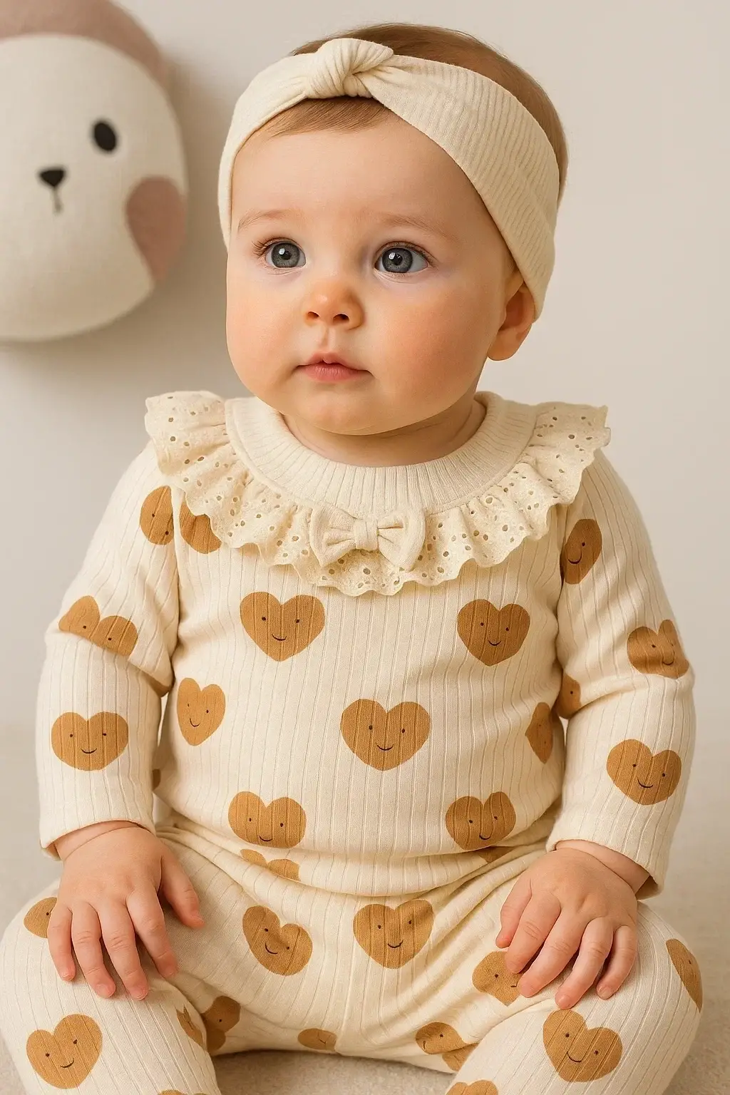Kalp Baskılı Fisto Yaka 3 Parça Kız Bebek Takımı %100 Pamuk
