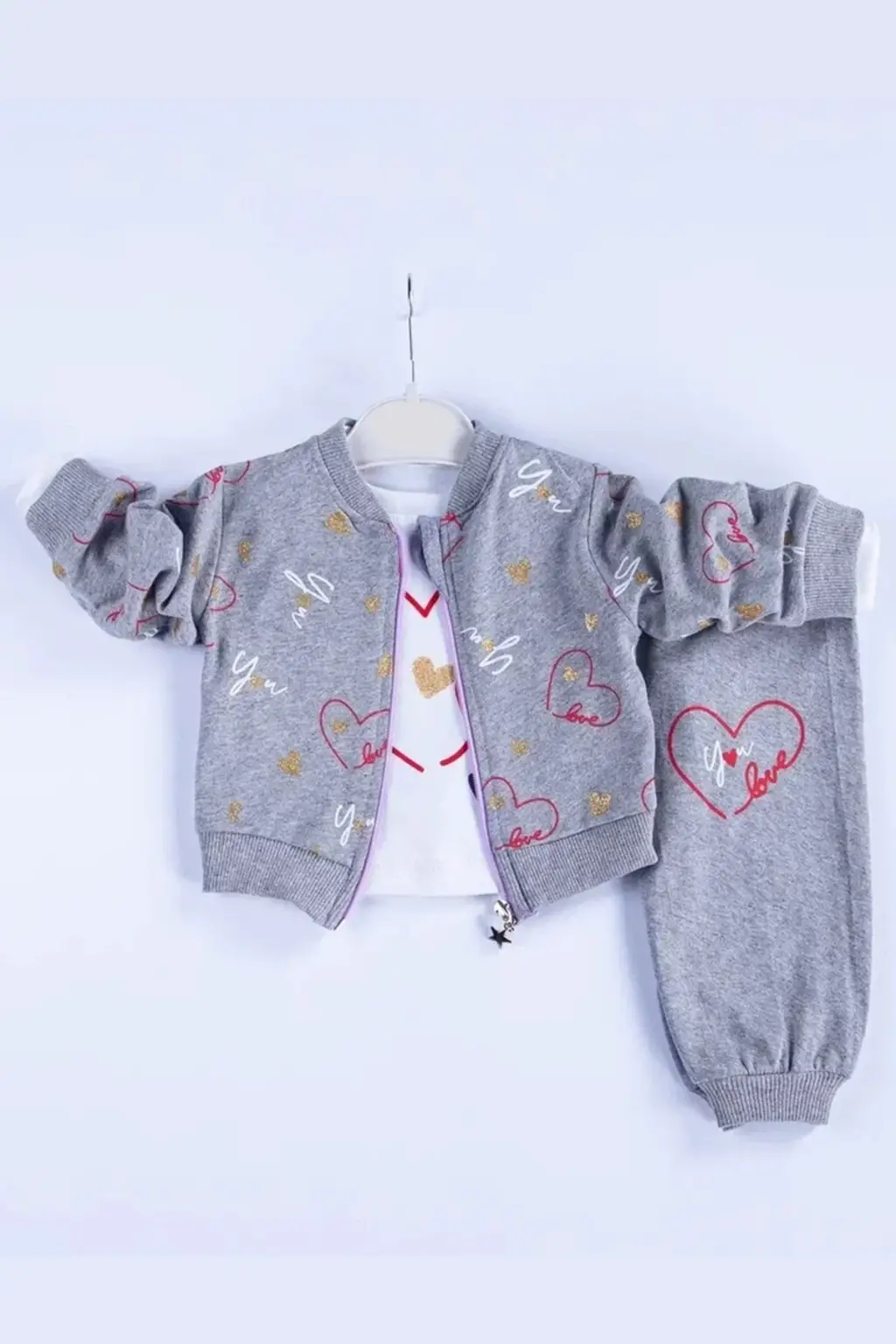 Kalp Desenli Hırkalı Pamuklu 3'lü Kız Bebek Takımı